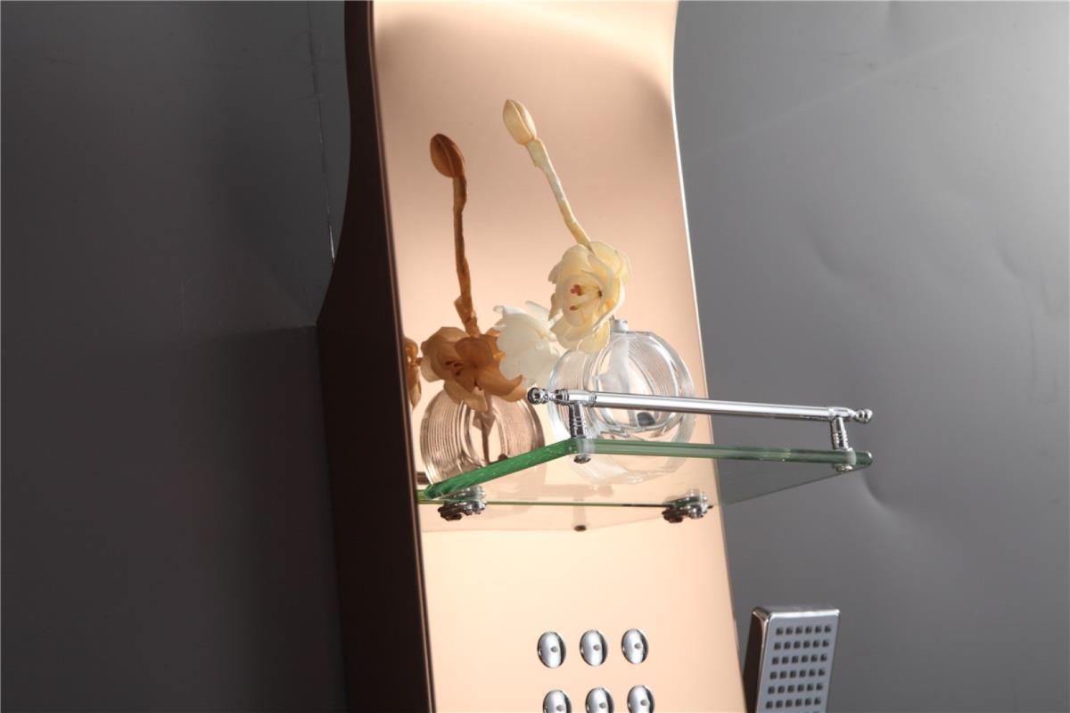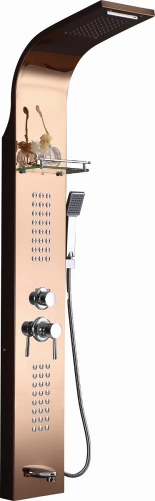 1x rvs douchepaneel, model: 5510 rose goud, functies: 1xbodyjets, 1xhoofddouche, 1xhanddouche, 1x voetwaterval, 1x hoofdwaterval, mengkraan, flexibele slang 150cm, met extra schab voor shampoo, afm. 150x22cm (hxb), dit betreft een nieuw product in doos.