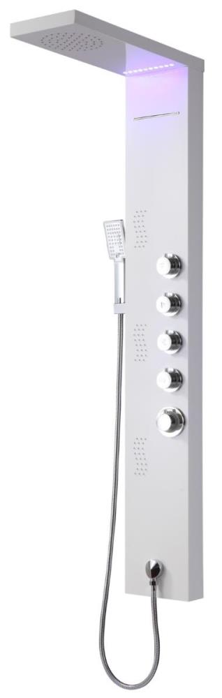1x rvs douchepaneel met LED, model: 5514 wit matt , functies: 1xbodyjets, 1xhoofddouche, 1xhanddouche, 1x hoofdwaterval, mengkraan, flexibele slang 150cm, afm. 150x22cm (hxb), dit betreft een nieuw product in doos.