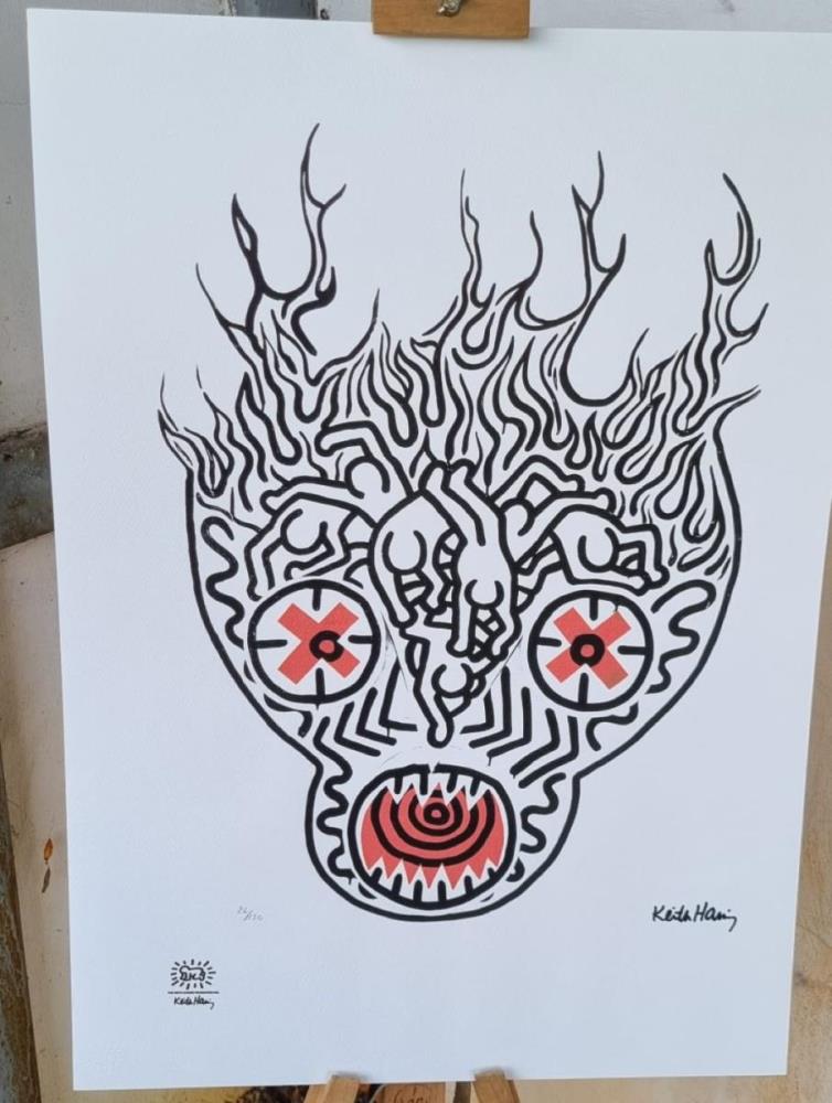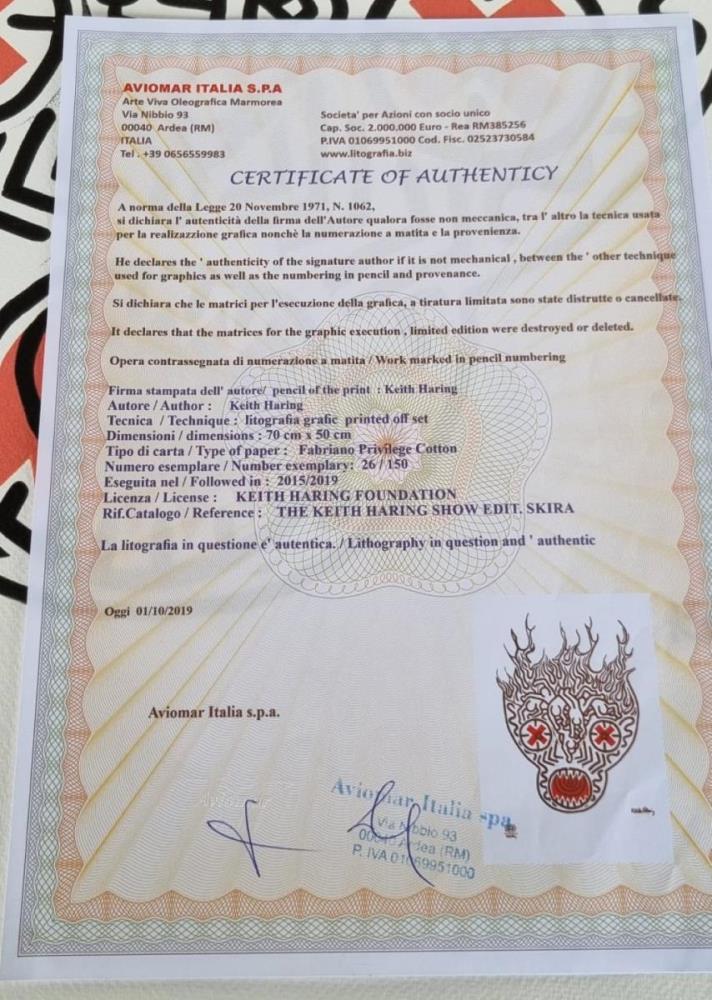 Originele en beperkte lithografie door Keith Haring, stempel in relief , beperkt en genummerd (26/150), Fabraino Cotton Privilege, , Echtheidscertificaat, GRATIS VERZENDING IN BELGIE