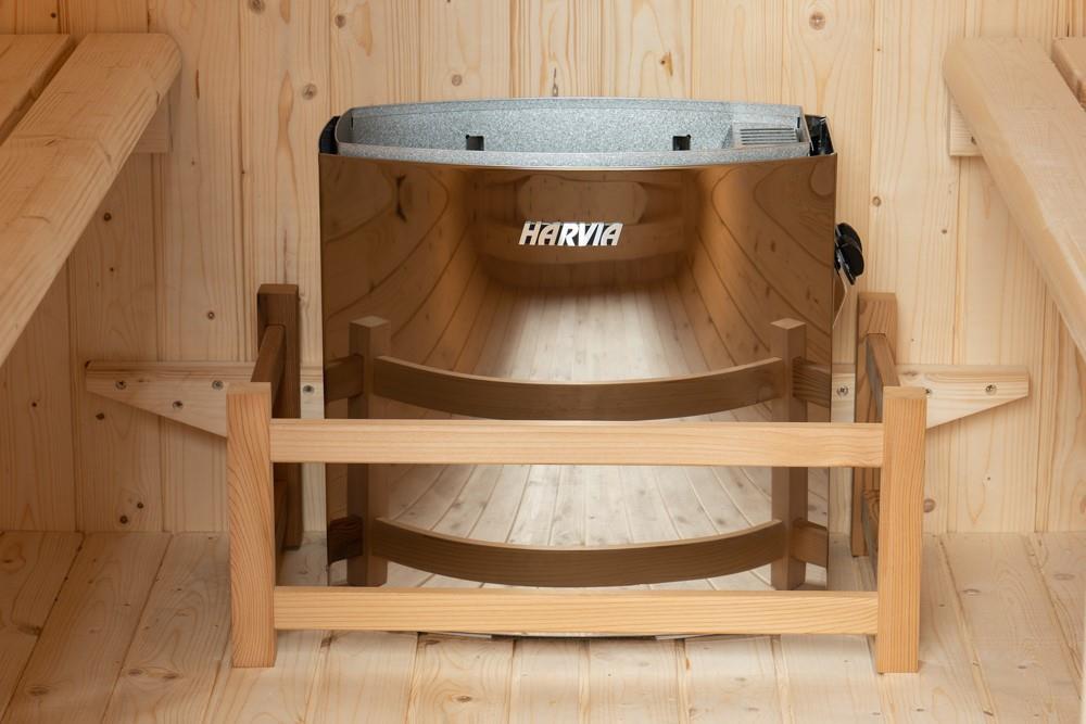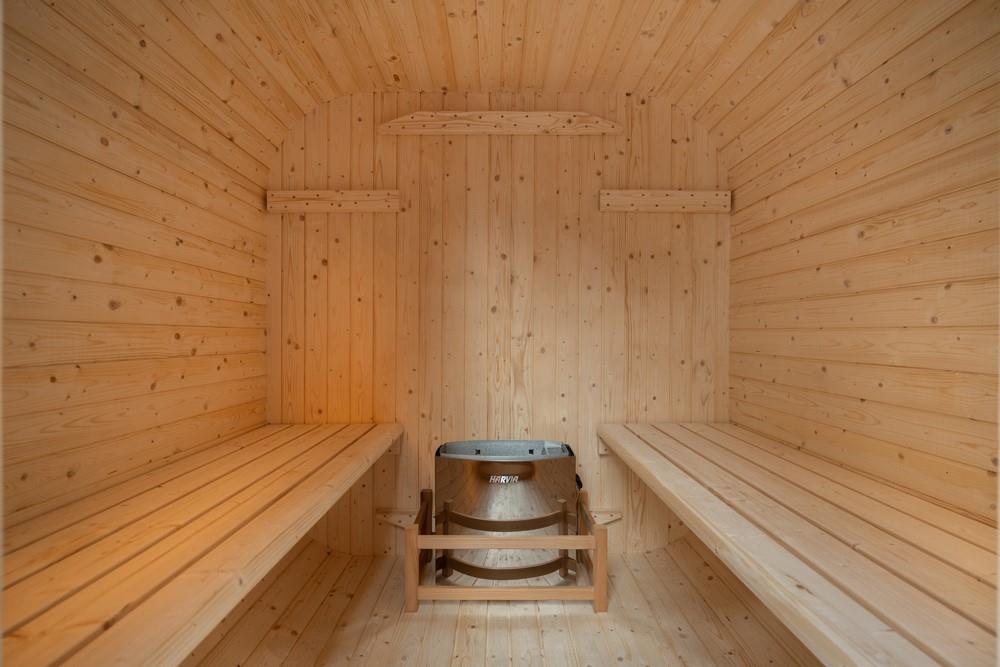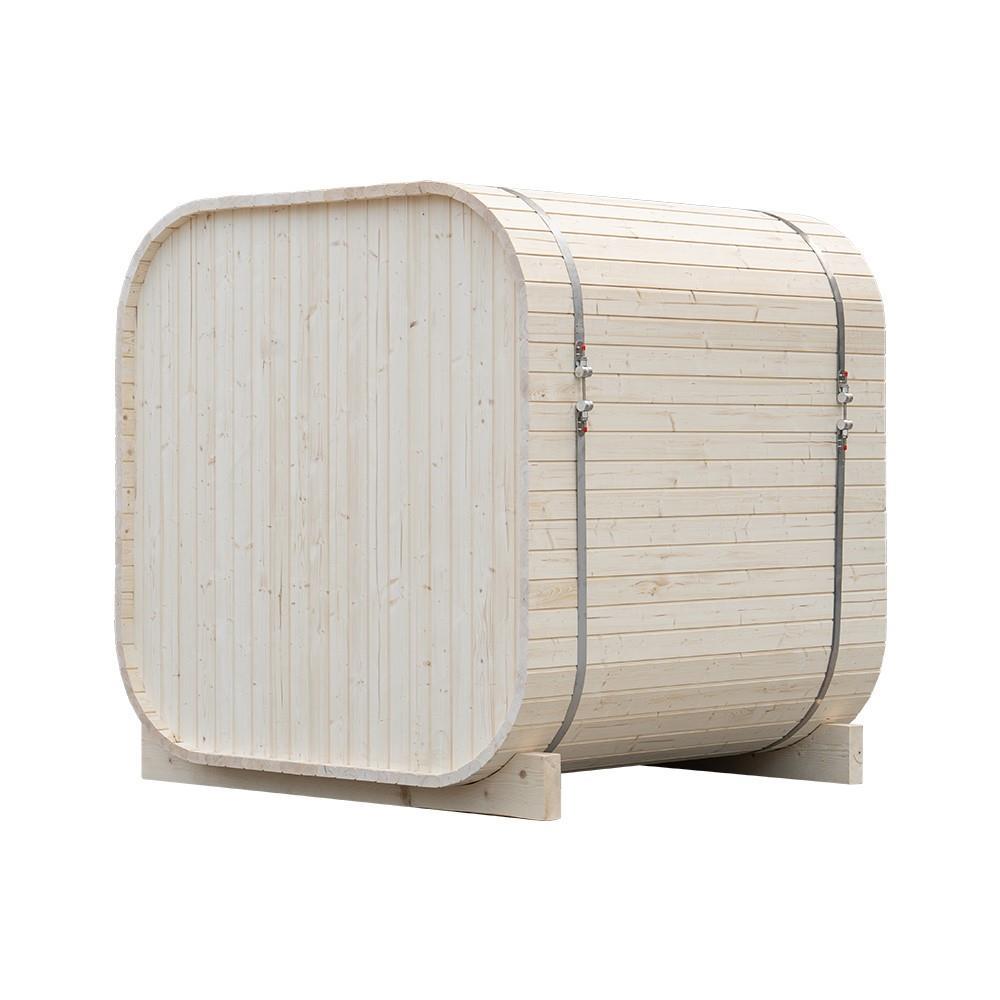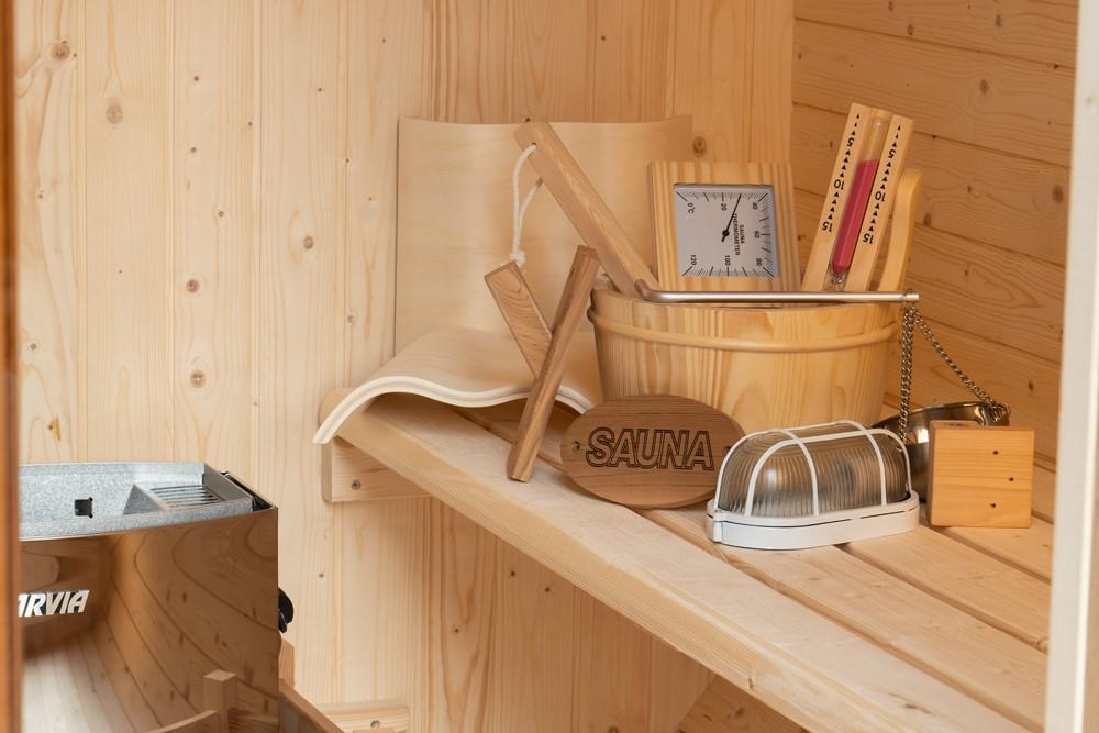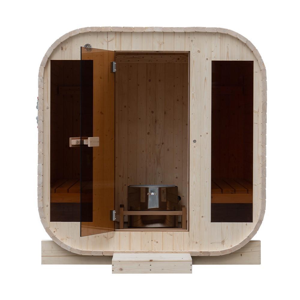 1x vierkant Pod sauna met getint glas, houtsoort: Finland Pine; geschikt voor 4-5 personen; inclusief: thermometer, hygrometer, glazen zandloper, hoofdsteun, glazen sauna deur, 6KW kachel 'Harvia', afmetingen: 1800x1800x1800mm