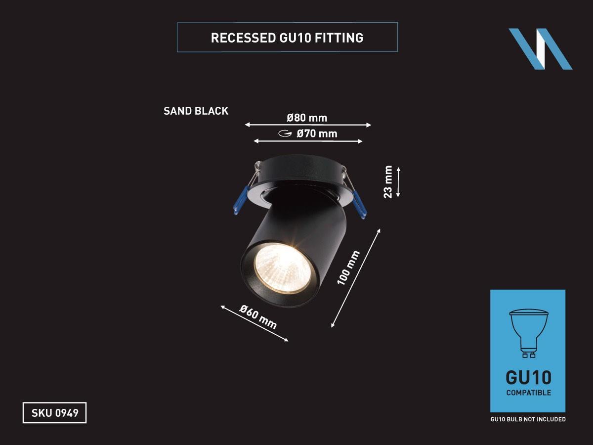 20 x GU10 Inbouwspot Armatuur cilinder zand zwart draaibaar - afdichting IP20 - product kleur zand zwart - afm. Ø 60 x 100mm - inbouwdiameter ø 70mm - draaibaar 350° en kantelbaar 50° - materiaal aluminum - bevestiging inclusief - fitting GU10 - bulb niet inbegrepen - geschikt voor binnen - een bulb invoer - voltage 220-240V - max 40 watt - SKU 00949