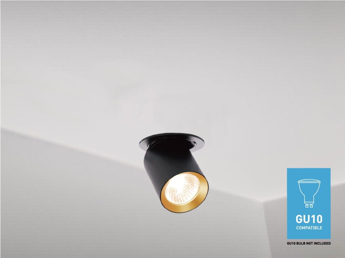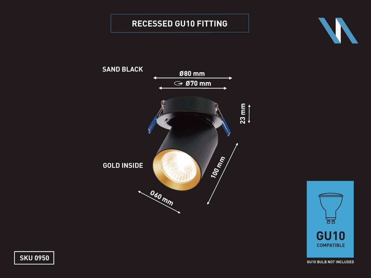 10 x GU10 Inbouwspot Armatuur cilinder zand zwart en goud draaibaar - afdichting IP20 - product kleur zand zwart en goud ring - afm. Ø 60 x 100mm - inbouwdiameter ø 70mm - draaibaar 350° en kantelbaar 50° - materiaal aluminum - bevestiging inclusief - fitting GU10 - bulb niet inbegrepen - geschikt voor binnen - een bulb invoer - voltage 220-240V - max 40 watt - SKU 00950