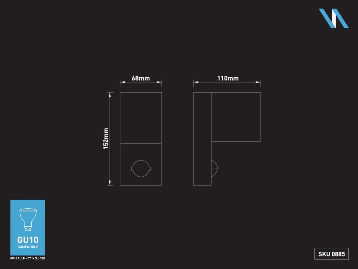 4 x Wandlamp modern rechthoekig GU10 fitting zand zwart waterdicht met sensor - IP44 waterdicht - met beweging sensor - afm. 110 x 68 x 152 mm - materiaal aluminum en glas diffuser - bevestiging inclusief - GU10 fitting - bulb niet inbegrepen - geschikt voor binnen en buiten - een bulb invoer - voltage 220-240V - max 35 watt - SKU 00885