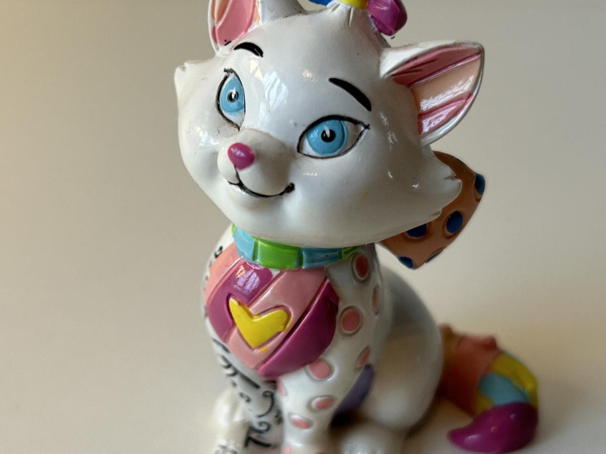 Origineel keramiek Disney-beeld en verzamelobject van de kat uit de Aristokatten, vervaardigd uit hoogwaardige polyresin steenhars door kunstenaar Romero Britto. Afmeting: +/- 9 à 10 cm. Staat/conditie: Perfecte nieuwstaat, zonder originele verpakking en verpakkingsdoos. Uitgever: Enesco/Romero Britto. Reeks/collectie: Disney by Britto uit Popshop Gallery (shopbritto.com) - Showcase collection. Authenticiteitszegel onderaan het beeld (zie foto's) en handtekening in beeld gegraveerd (zie foto). Galerijprijs: 100 dollar (zie shopbritto.com). Beelden nemen in waarde toe, vermits ze gelimiteerd worden geproduceerd en momenteel niet meer worden vervaardigd. Braziliaans kunstenaar Romero Britto staat bekend om zijn vrolijke en bonte gebruik van kleuren en patronen. Hij combineert klassieke Disney-figuren met pop-art-designs, De beeldjes zijn stuk voor stuk herkenbare Disney-karakters, maar gezien door de ogen van Britto. Een lust voor het oog en een kleurrijke eyecatcher in je interieur. De beelden worden handbeschilderd, dus minimale afwijkingen in kleur en/of afwerking kunnen voorkomen.