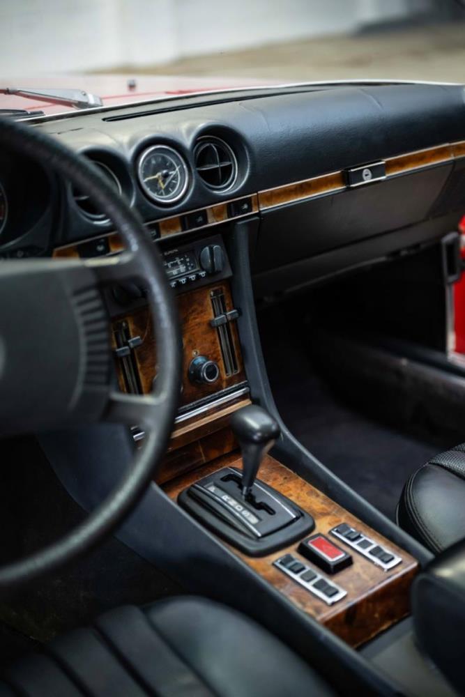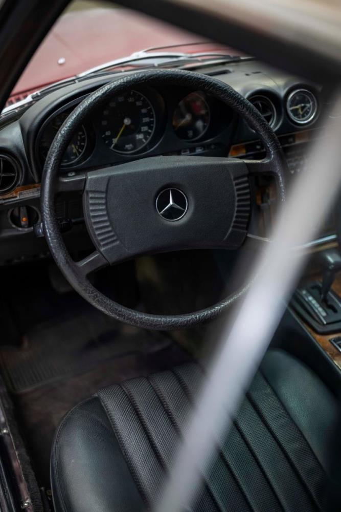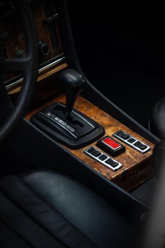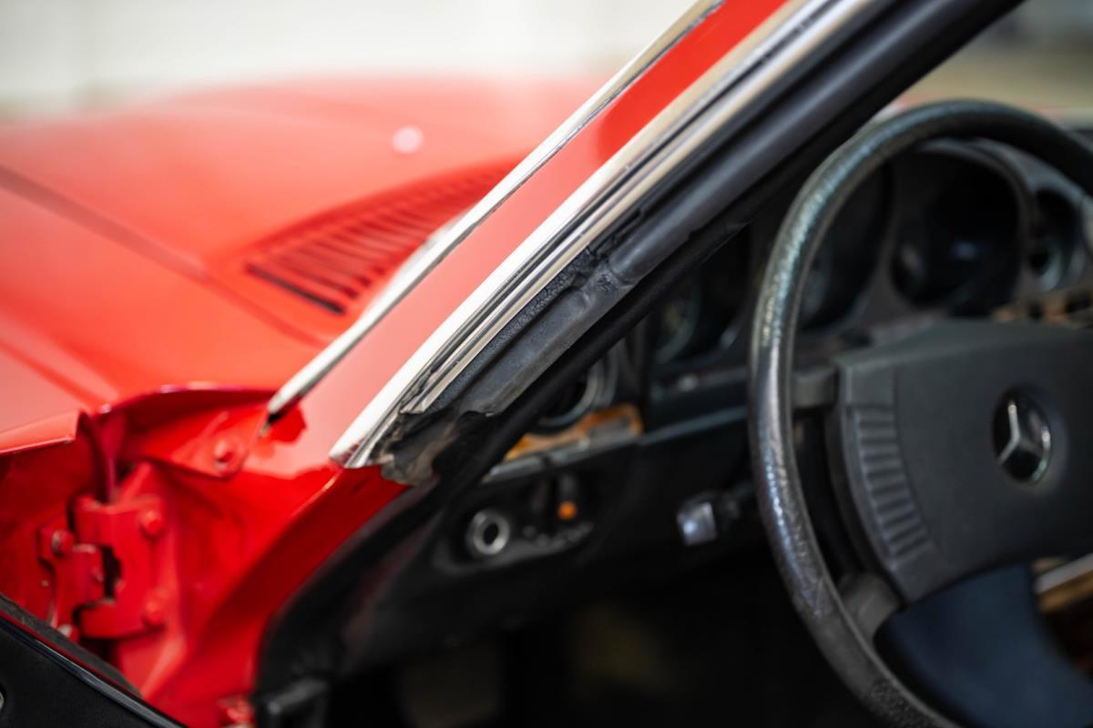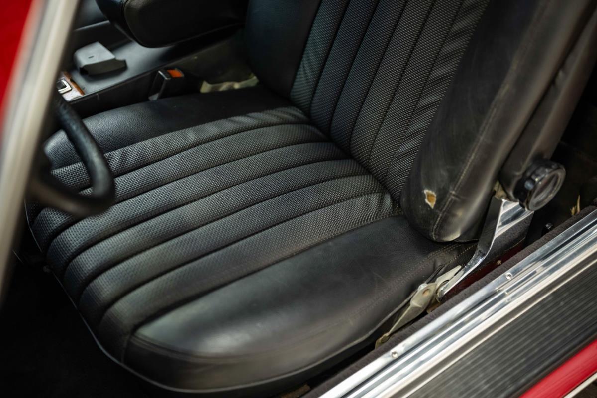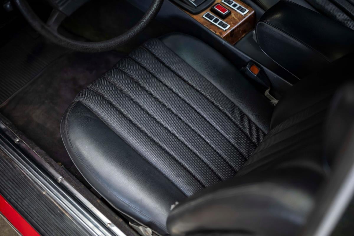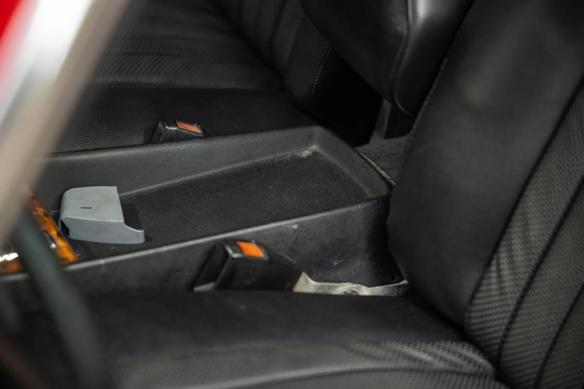 De opnieuw gespoten carrosserie ziet er geweldig uit, nietwaar? Helder en levendig, het werd duidelijk aangebracht door iemand die wist wat hij deed, maar het canvas waarop het werd aangebracht is even indrukwekkend. Met strakke en consistente shutlines komt de legendarische M-B-bouwkwaliteit tot uiting, zelfs na al die jaren. Zoals je zou verwachten na een hoogwaardige overspuitbeurt die sindsdien weinig nut heeft gehad, zijn er geen deuken, deuken of andere beschadigingen die de afwerking kunnen verpesten. De 450SLC was niet afgewerkt met veel chroom, maar wat er wel is, is recht en vrij van roest en putjes. Het schuifdak past goed in de opening en sluit goed af, en er zijn twee goede mistlampen en een set nieuwe kentekenplaten. De originele 14-inch lichtmetalen velgen zijn ook in prima staat. Glanzend en smetteloos, ze zijn uitgerust met een bijpassende set Bridgestone Turanza GR-80 banden. We zullen het nooit beu worden om u te vertellen dat de ervaring leert dat bijpassende banden van hoge kwaliteit een onfeilbaar teken zijn van een zorgzame en mechanisch sympathieke eigenaar die bereid is het juiste bedrag uit te geven aan het juiste onderhoud van zijn auto. Hun aanwezigheid sluit uiteraard de noodzaak van een grondige inspectie niet uit – iets wat de verkoper trouwens op prijs zou stellen – maar het geeft je misschien wel een korte weg naar hun houding ten opzichte van onderhoud. Wat het werk betreft: de rubberen bekleding op de bumpers is geschaafd en wankel, er zit een blaasje in de verf op het schuifdak, een deel van de afdichtingsrubbers is vergaan, er zit een klein chipje aan de bovenkant van het raamglas van het bestuurdersportier, sommige Het glas van de andere kant is bekrast, de lens van de buitenzijde van de achterlamp is geschaafd en er zitten wat oneffenheden in de lakafwerking op de voorspatbord aan de zijkant, de motorkap en onder de achterruit.