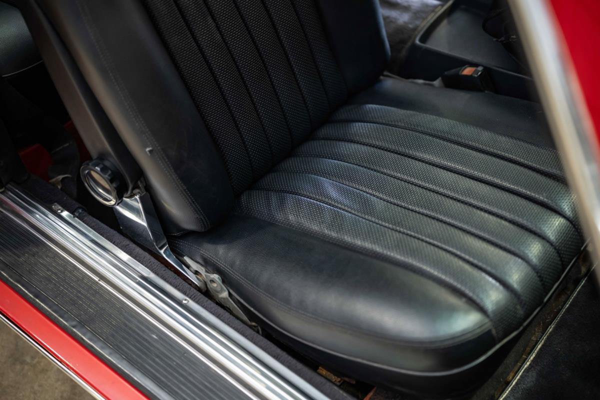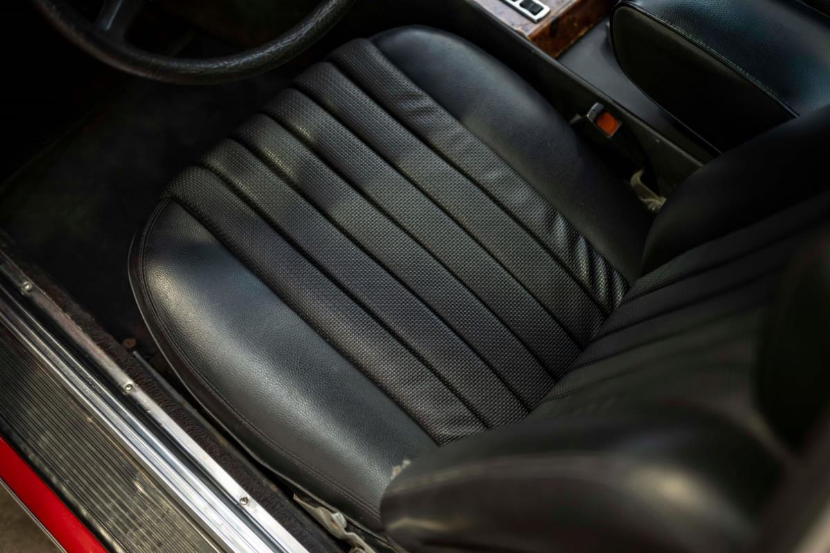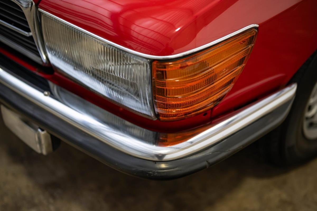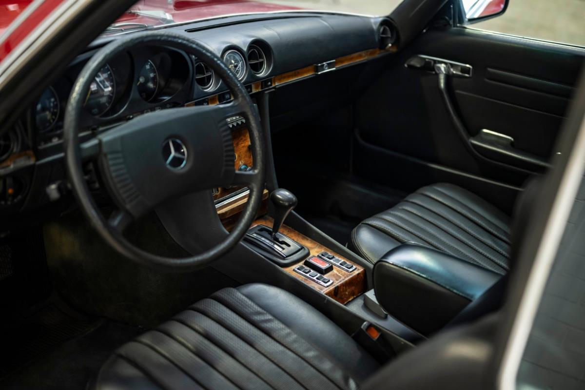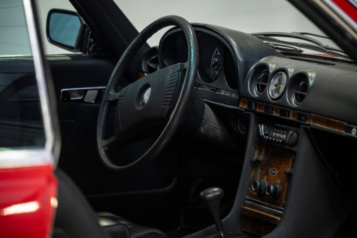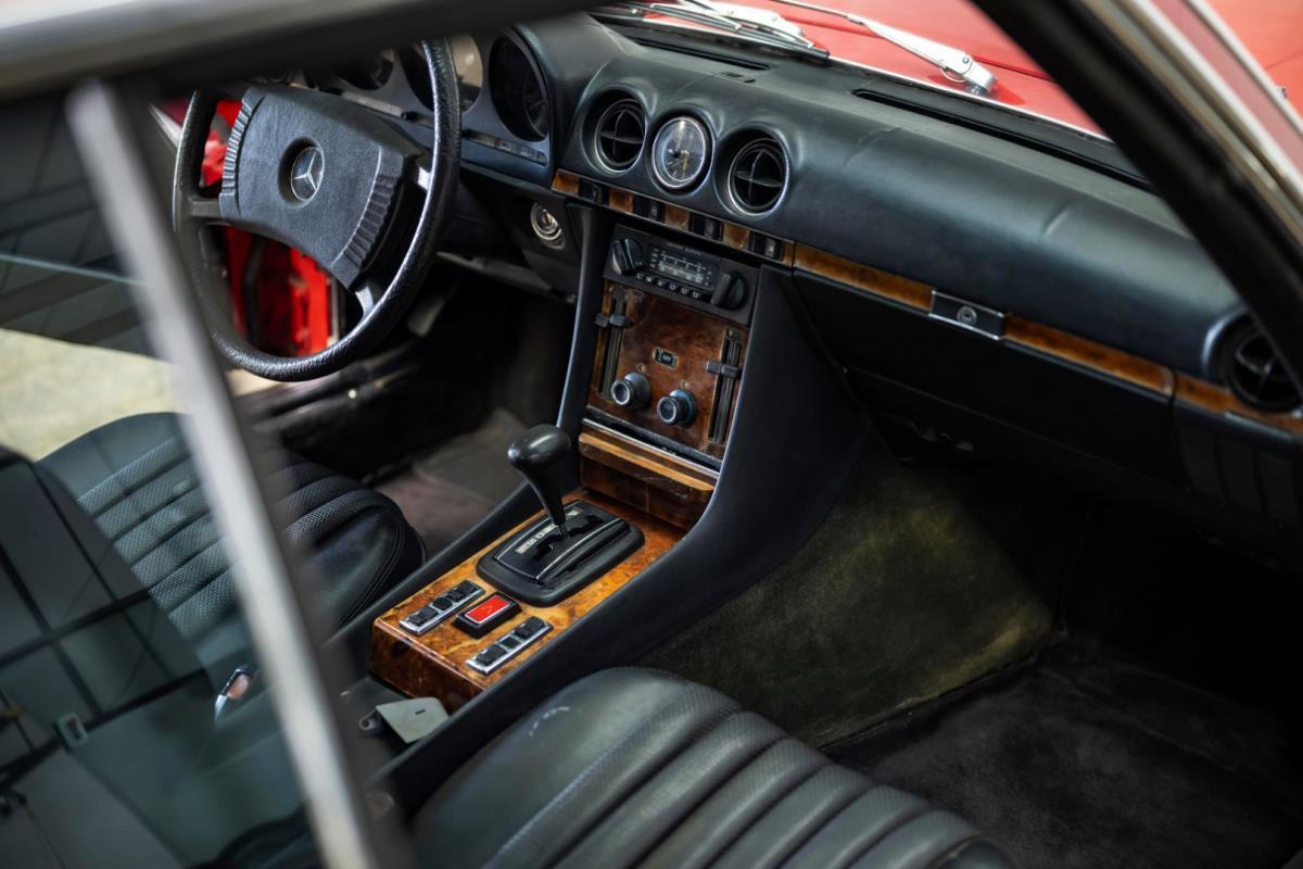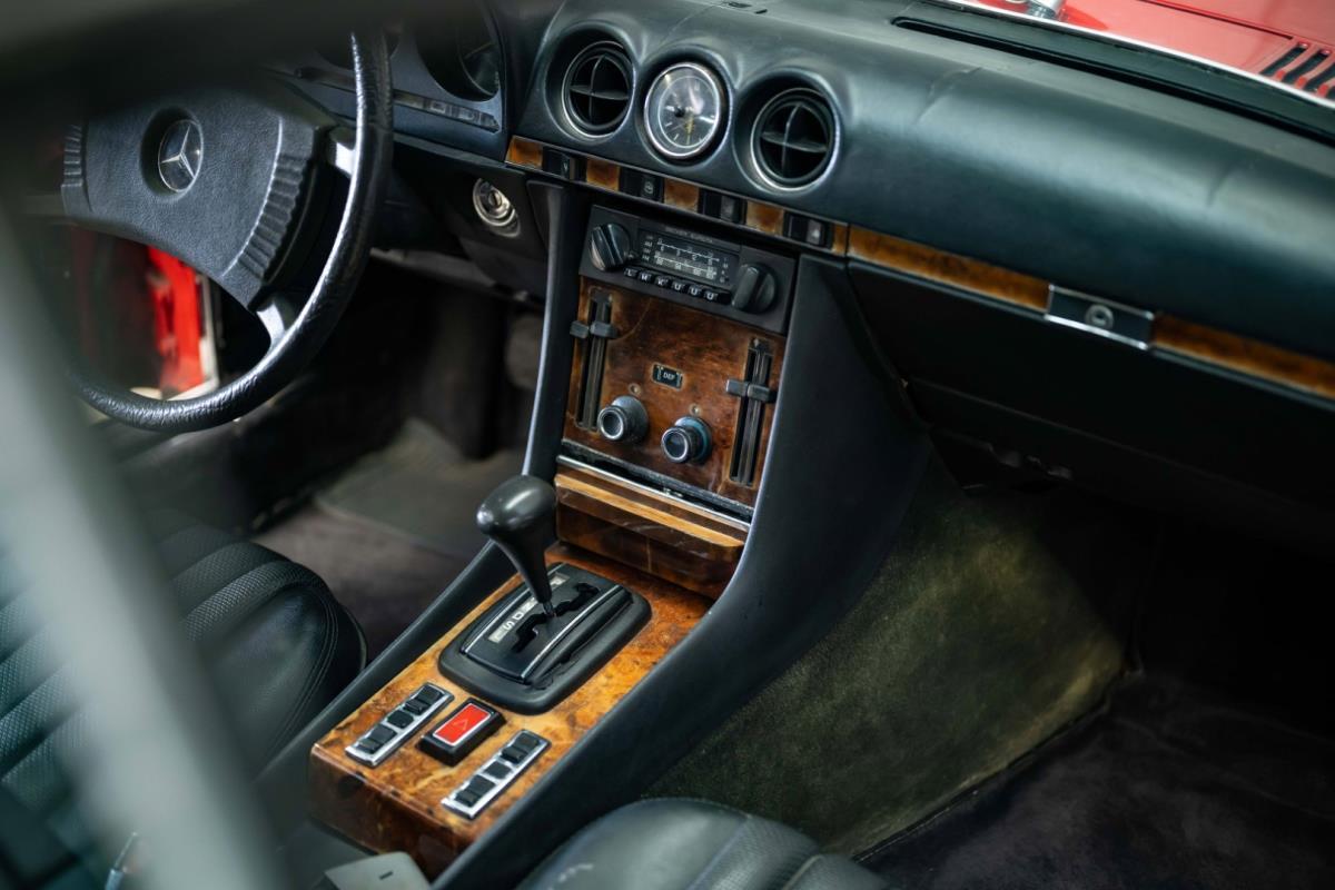 De opnieuw gespoten carrosserie ziet er geweldig uit, nietwaar? Helder en levendig, het werd duidelijk aangebracht door iemand die wist wat hij deed, maar het canvas waarop het werd aangebracht is even indrukwekkend. Met strakke en consistente shutlines komt de legendarische M-B-bouwkwaliteit tot uiting, zelfs na al die jaren. Zoals je zou verwachten na een hoogwaardige overspuitbeurt die sindsdien weinig nut heeft gehad, zijn er geen deuken, deuken of andere beschadigingen die de afwerking kunnen verpesten. De 450SLC was niet afgewerkt met veel chroom, maar wat er wel is, is recht en vrij van roest en putjes. Het schuifdak past goed in de opening en sluit goed af, en er zijn twee goede mistlampen en een set nieuwe kentekenplaten. De originele 14-inch lichtmetalen velgen zijn ook in prima staat. Glanzend en smetteloos, ze zijn uitgerust met een bijpassende set Bridgestone Turanza GR-80 banden. We zullen het nooit beu worden om u te vertellen dat de ervaring leert dat bijpassende banden van hoge kwaliteit een onfeilbaar teken zijn van een zorgzame en mechanisch sympathieke eigenaar die bereid is het juiste bedrag uit te geven aan het juiste onderhoud van zijn auto. Hun aanwezigheid sluit uiteraard de noodzaak van een grondige inspectie niet uit – iets wat de verkoper trouwens op prijs zou stellen – maar het geeft je misschien wel een korte weg naar hun houding ten opzichte van onderhoud. Wat het werk betreft: de rubberen bekleding op de bumpers is geschaafd en wankel, er zit een blaasje in de verf op het schuifdak, een deel van de afdichtingsrubbers is vergaan, er zit een klein chipje aan de bovenkant van het raamglas van het bestuurdersportier, sommige Het glas van de andere kant is bekrast, de lens van de buitenzijde van de achterlamp is geschaafd en er zitten wat oneffenheden in de lakafwerking op de voorspatbord aan de zijkant, de motorkap en onder de achterruit.