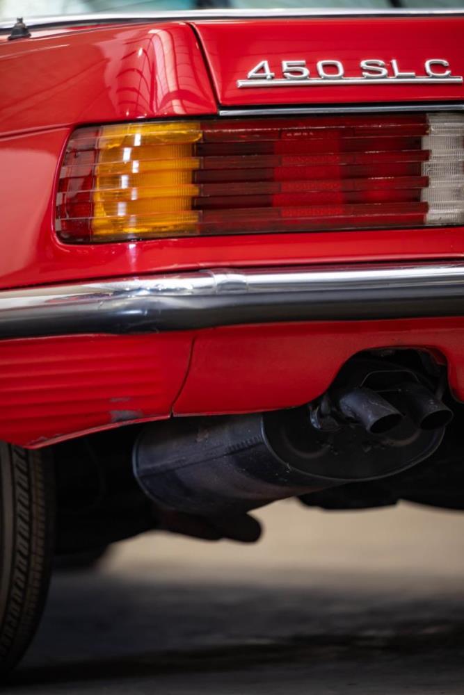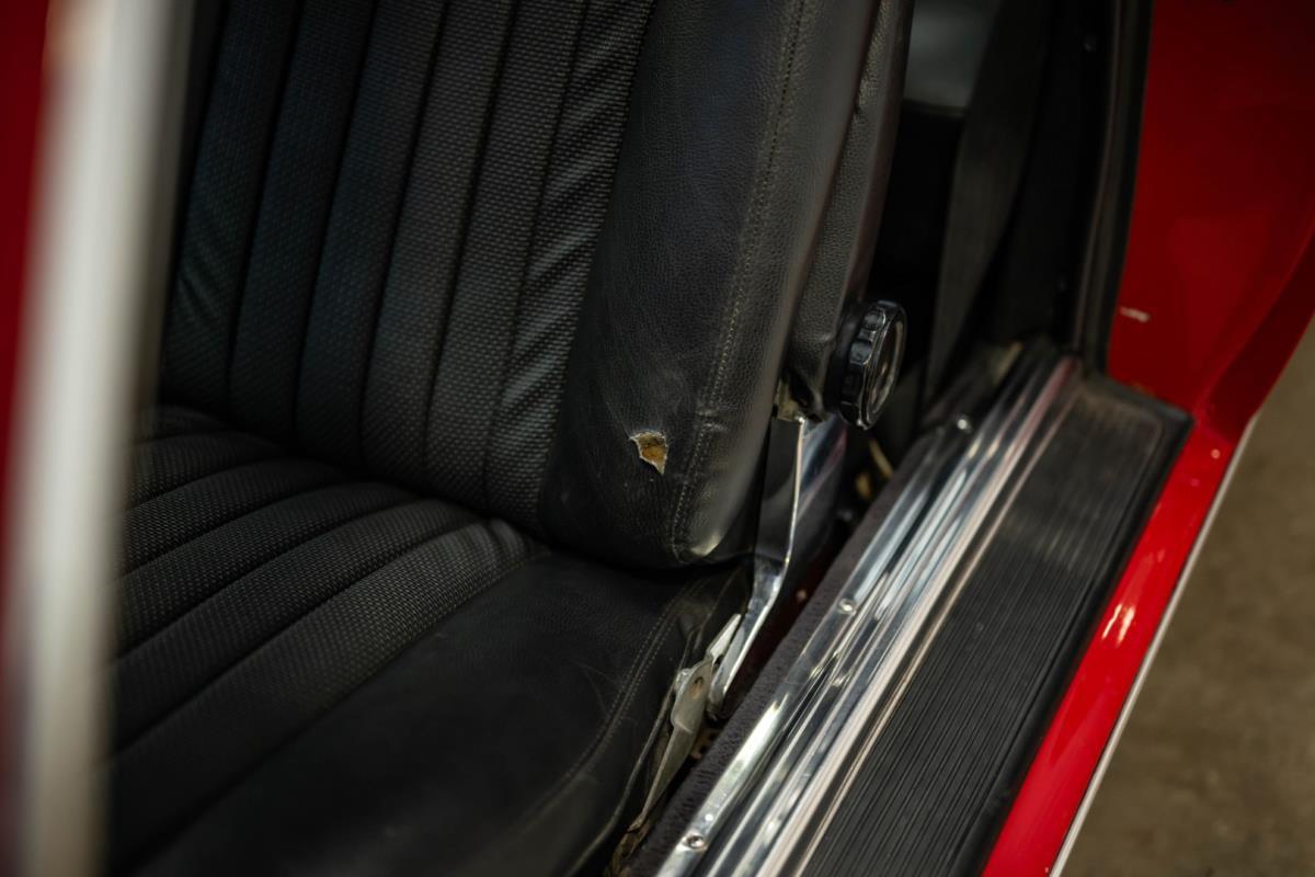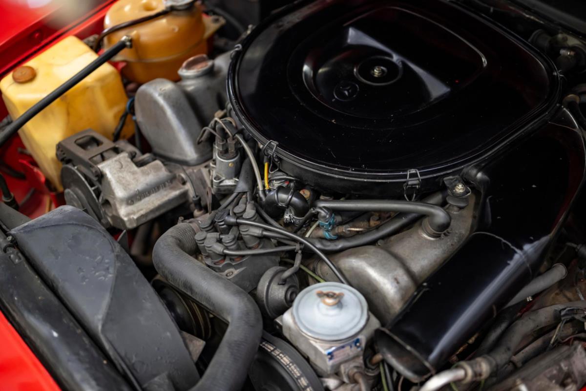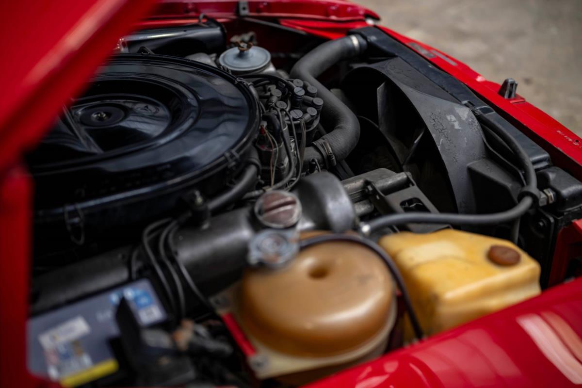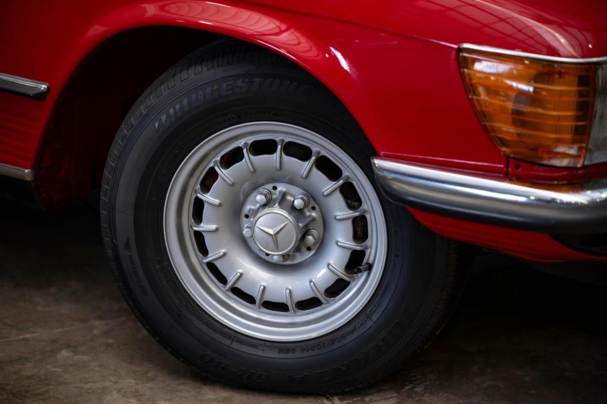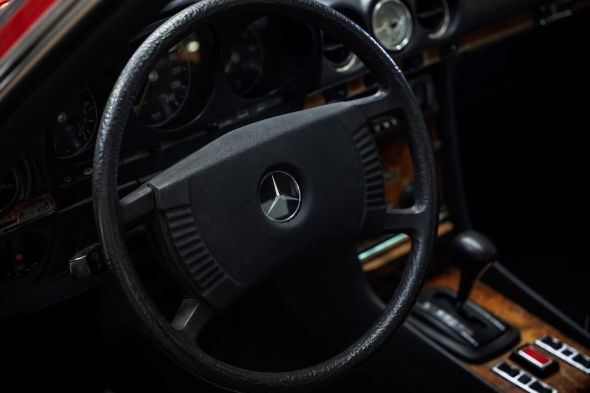 De opnieuw gespoten carrosserie ziet er geweldig uit, nietwaar? Helder en levendig, het werd duidelijk aangebracht door iemand die wist wat hij deed, maar het canvas waarop het werd aangebracht is even indrukwekkend. Met strakke en consistente shutlines komt de legendarische M-B-bouwkwaliteit tot uiting, zelfs na al die jaren. Zoals je zou verwachten na een hoogwaardige overspuitbeurt die sindsdien weinig nut heeft gehad, zijn er geen deuken, deuken of andere beschadigingen die de afwerking kunnen verpesten. De 450SLC was niet afgewerkt met veel chroom, maar wat er wel is, is recht en vrij van roest en putjes. Het schuifdak past goed in de opening en sluit goed af, en er zijn twee goede mistlampen en een set nieuwe kentekenplaten. De originele 14-inch lichtmetalen velgen zijn ook in prima staat. Glanzend en smetteloos, ze zijn uitgerust met een bijpassende set Bridgestone Turanza GR-80 banden. We zullen het nooit beu worden om u te vertellen dat de ervaring leert dat bijpassende banden van hoge kwaliteit een onfeilbaar teken zijn van een zorgzame en mechanisch sympathieke eigenaar die bereid is het juiste bedrag uit te geven aan het juiste onderhoud van zijn auto. Hun aanwezigheid sluit uiteraard de noodzaak van een grondige inspectie niet uit – iets wat de verkoper trouwens op prijs zou stellen – maar het geeft je misschien wel een korte weg naar hun houding ten opzichte van onderhoud. Wat het werk betreft: de rubberen bekleding op de bumpers is geschaafd en wankel, er zit een blaasje in de verf op het schuifdak, een deel van de afdichtingsrubbers is vergaan, er zit een klein chipje aan de bovenkant van het raamglas van het bestuurdersportier, sommige Het glas van de andere kant is bekrast, de lens van de buitenzijde van de achterlamp is geschaafd en er zitten wat oneffenheden in de lakafwerking op de voorspatbord aan de zijkant, de motorkap en onder de achterruit.