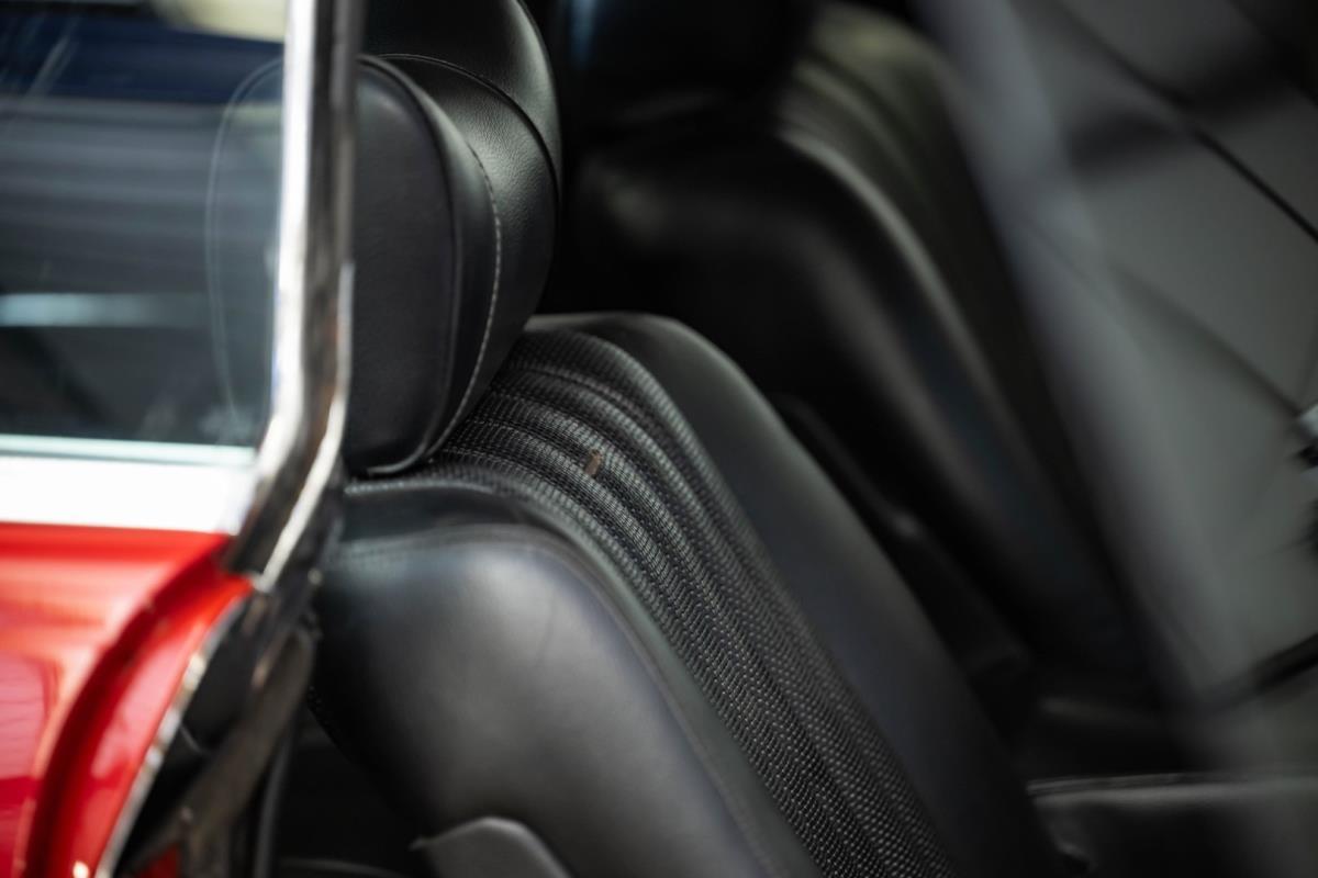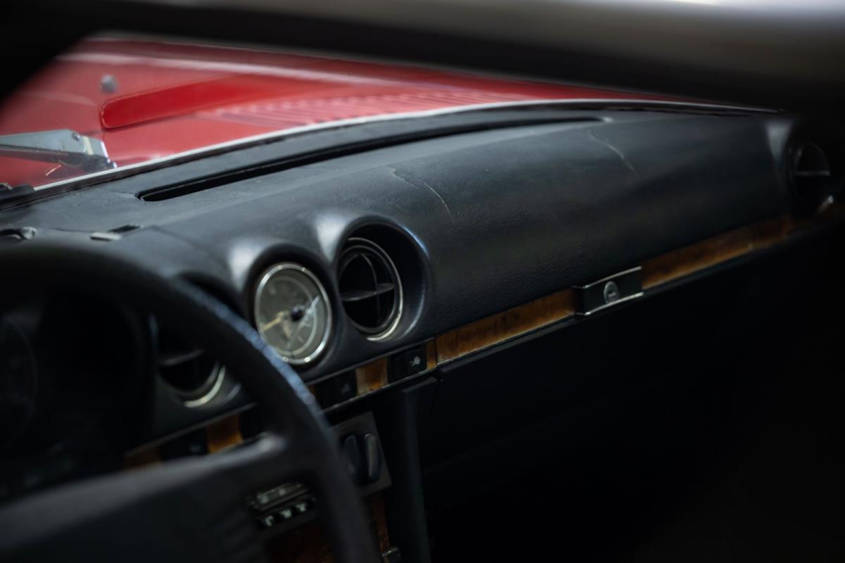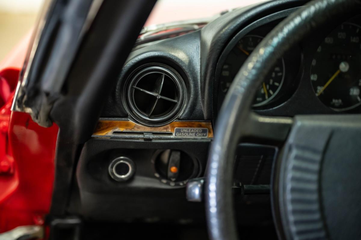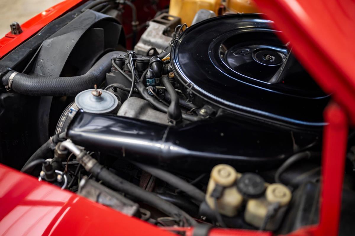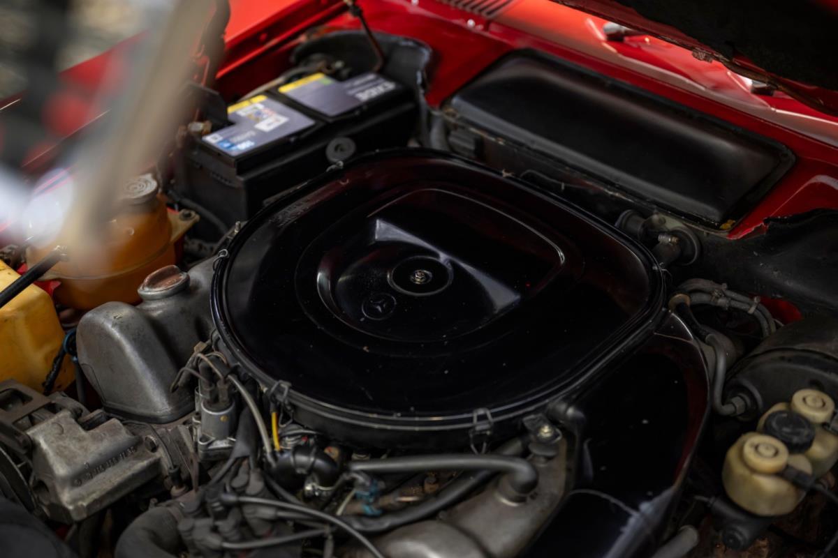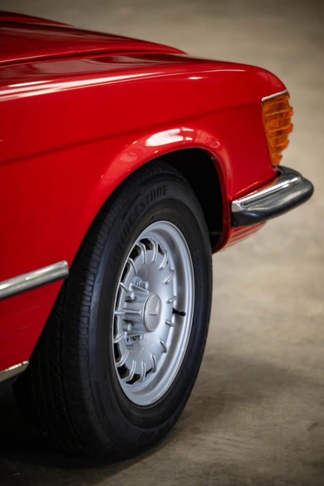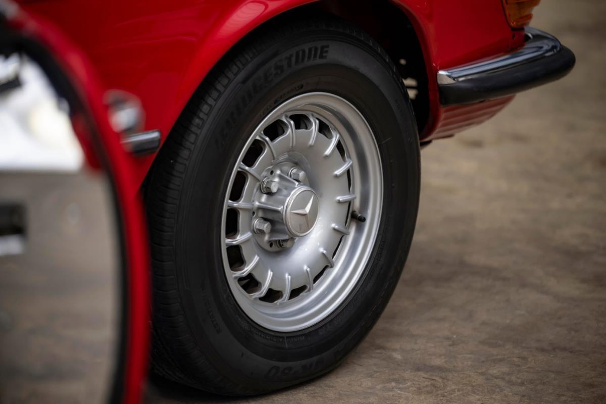 De opnieuw gespoten carrosserie ziet er geweldig uit, nietwaar? Helder en levendig, het werd duidelijk aangebracht door iemand die wist wat hij deed, maar het canvas waarop het werd aangebracht is even indrukwekkend. Met strakke en consistente shutlines komt de legendarische M-B-bouwkwaliteit tot uiting, zelfs na al die jaren. Zoals je zou verwachten na een hoogwaardige overspuitbeurt die sindsdien weinig nut heeft gehad, zijn er geen deuken, deuken of andere beschadigingen die de afwerking kunnen verpesten. De 450SLC was niet afgewerkt met veel chroom, maar wat er wel is, is recht en vrij van roest en putjes. Het schuifdak past goed in de opening en sluit goed af, en er zijn twee goede mistlampen en een set nieuwe kentekenplaten. De originele 14-inch lichtmetalen velgen zijn ook in prima staat. Glanzend en smetteloos, ze zijn uitgerust met een bijpassende set Bridgestone Turanza GR-80 banden. We zullen het nooit beu worden om u te vertellen dat de ervaring leert dat bijpassende banden van hoge kwaliteit een onfeilbaar teken zijn van een zorgzame en mechanisch sympathieke eigenaar die bereid is het juiste bedrag uit te geven aan het juiste onderhoud van zijn auto. Hun aanwezigheid sluit uiteraard de noodzaak van een grondige inspectie niet uit – iets wat de verkoper trouwens op prijs zou stellen – maar het geeft je misschien wel een korte weg naar hun houding ten opzichte van onderhoud. Wat het werk betreft: de rubberen bekleding op de bumpers is geschaafd en wankel, er zit een blaasje in de verf op het schuifdak, een deel van de afdichtingsrubbers is vergaan, er zit een klein chipje aan de bovenkant van het raamglas van het bestuurdersportier, sommige Het glas van de andere kant is bekrast, de lens van de buitenzijde van de achterlamp is geschaafd en er zitten wat oneffenheden in de lakafwerking op de voorspatbord aan de zijkant, de motorkap en onder de achterruit.