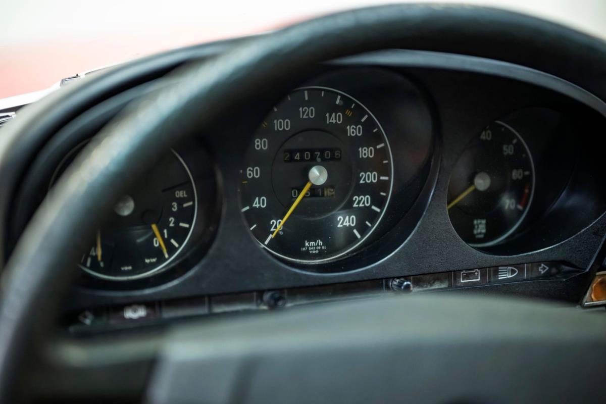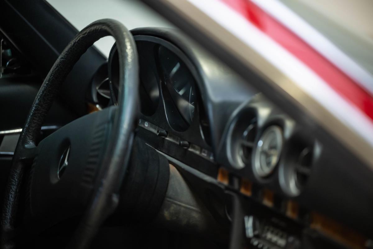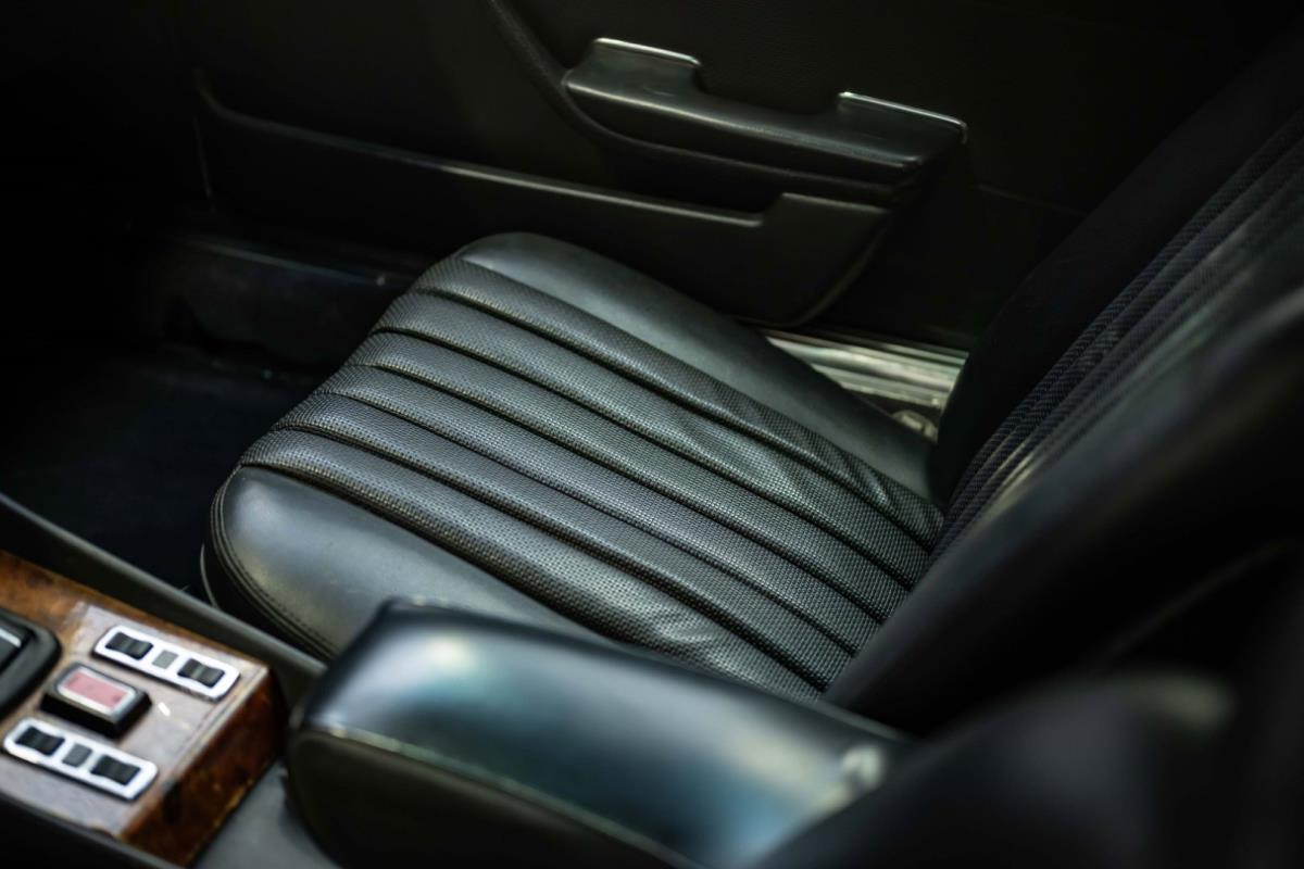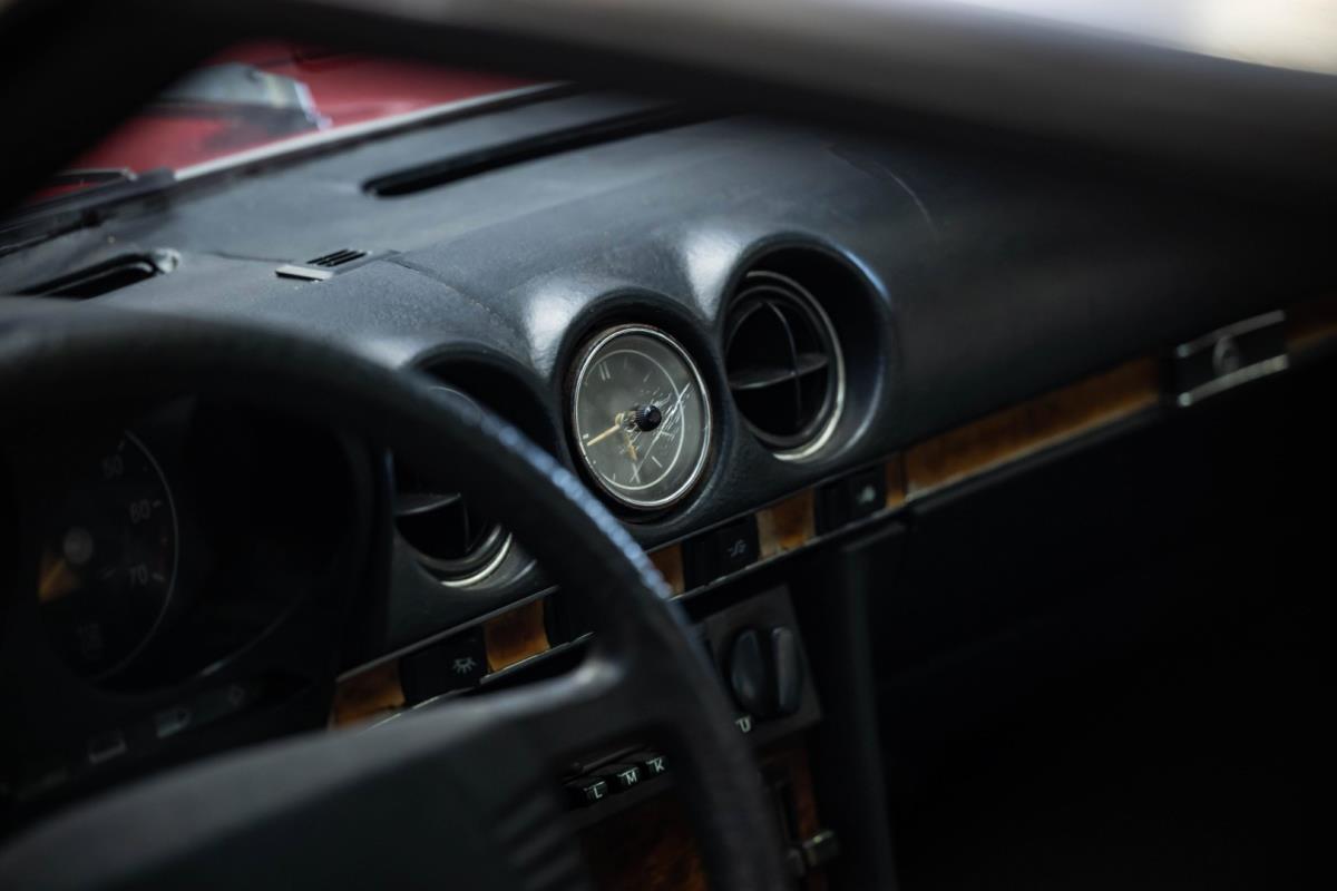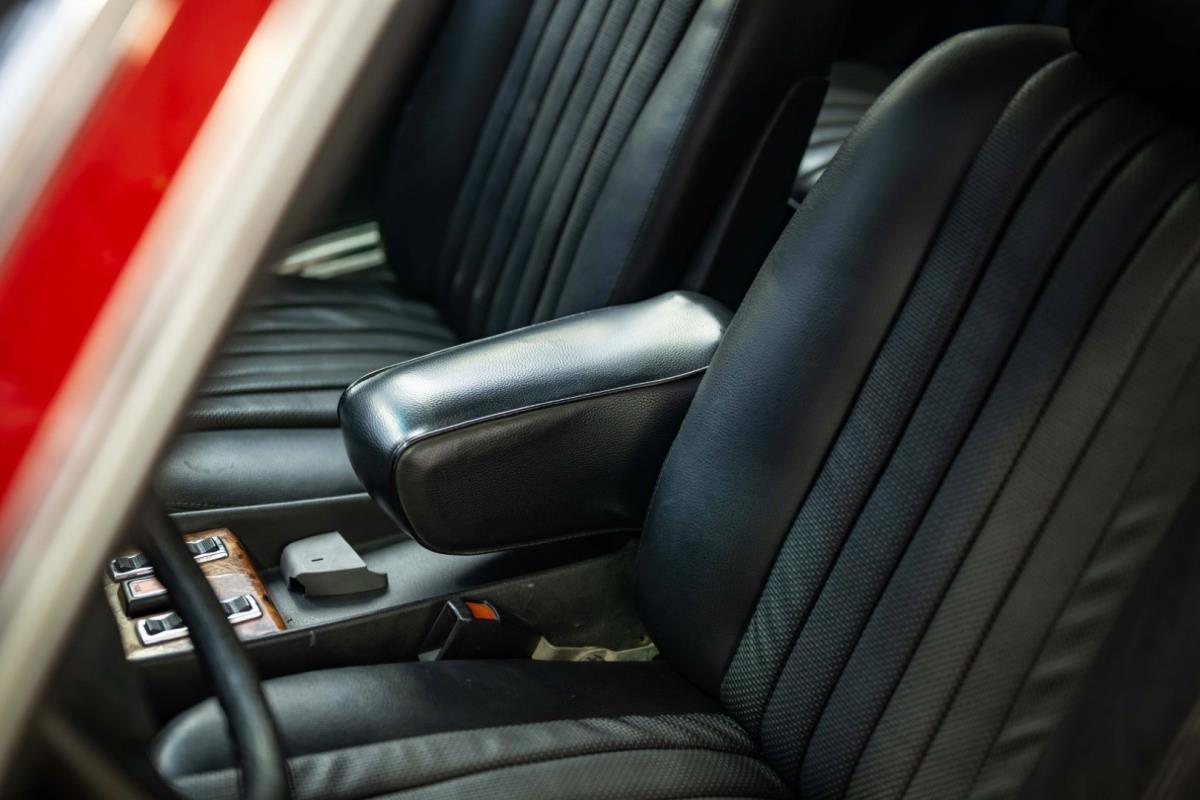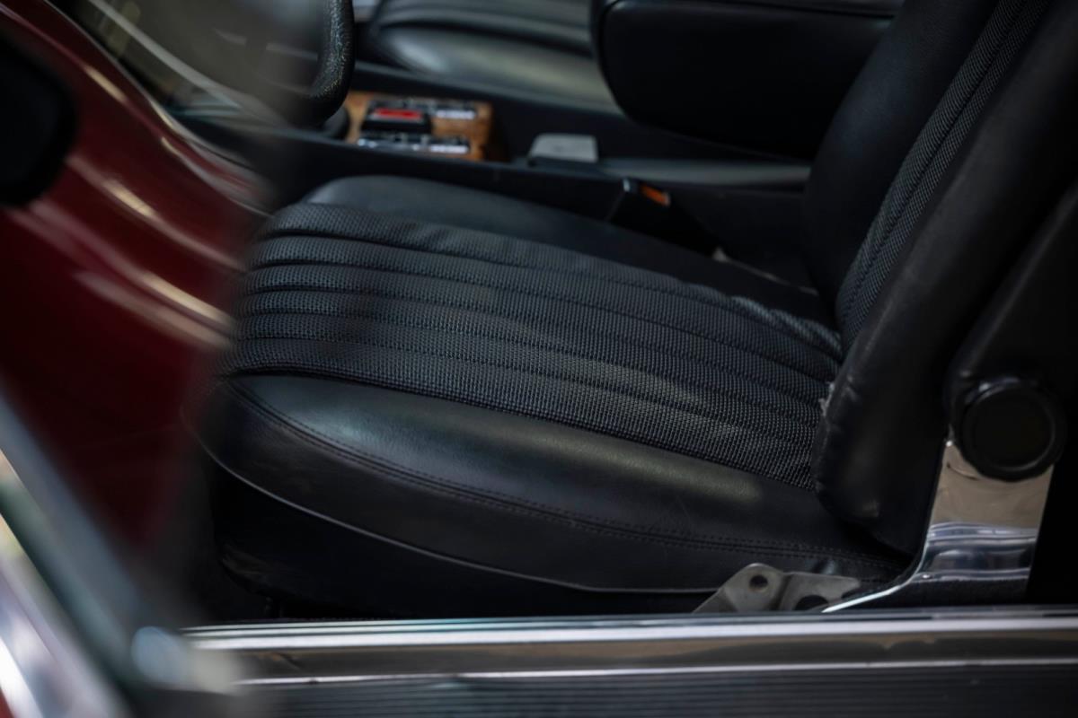 Het zwarte interieur is over het algemeen erg goed, waarbij de stoelen een echt hoogtepunt zijn. Ze zijn nog steeds mooi gepresenteerd, maar hebben de meegevende veerkracht behouden die uniek is voor Mercedes-Benz-auto's uit die periode. De bijpassende deurkaarten zijn ook uitstekend, net als de sierlijsten achteraan en de centrale armsteun vooraan. De achterstoelen zijn zelfs nog beter, omdat ze vrijwel ongemarkeerd zijn. En er is nog meer goed nieuws in de vorm van een Becker Europa-radio in het midden van het dashboard. Als je de krik en het volwaardige lichtmetalen reservewiel uit de kofferbak haalt, zie je daaronder niets anders dan massief metaal, wat goed is om te zien. Wat de gebreken betreft: een deel van het houtfineer is gebarsten en de lak is beschadigd, de bovenkant van het dashboard is gebarsten, de