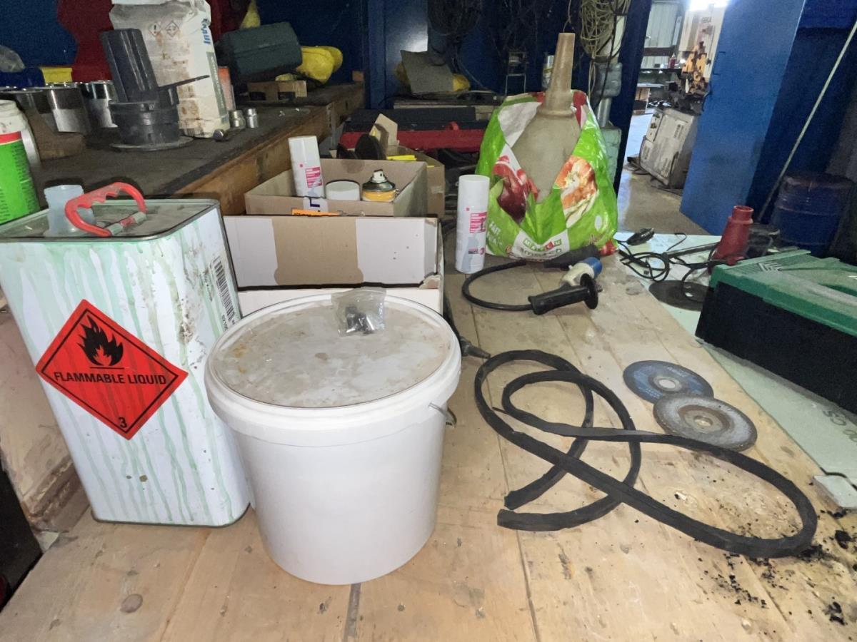 bu div gereedschapskoffers, div klein handgereedschap, isolatie + isolatie afval, elektrische kabels (wo defecte), verwarmingselementen, metalen kastje, tafel, ea