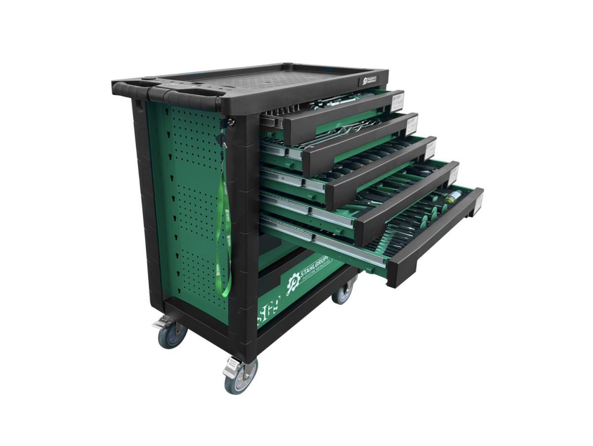 Dubbelwandig gepoedercoat staalplaat; perforatiepanelen om extra gereedschap aan te bevestigen; centrale vergrendeling met cilinderslot; dubbel kogel gelagerde gereedschapslades; lades met veiligheidsblokkering; totale belasting tot 500 kg; met 2 vaste wielen en 2 zwenkwielen;