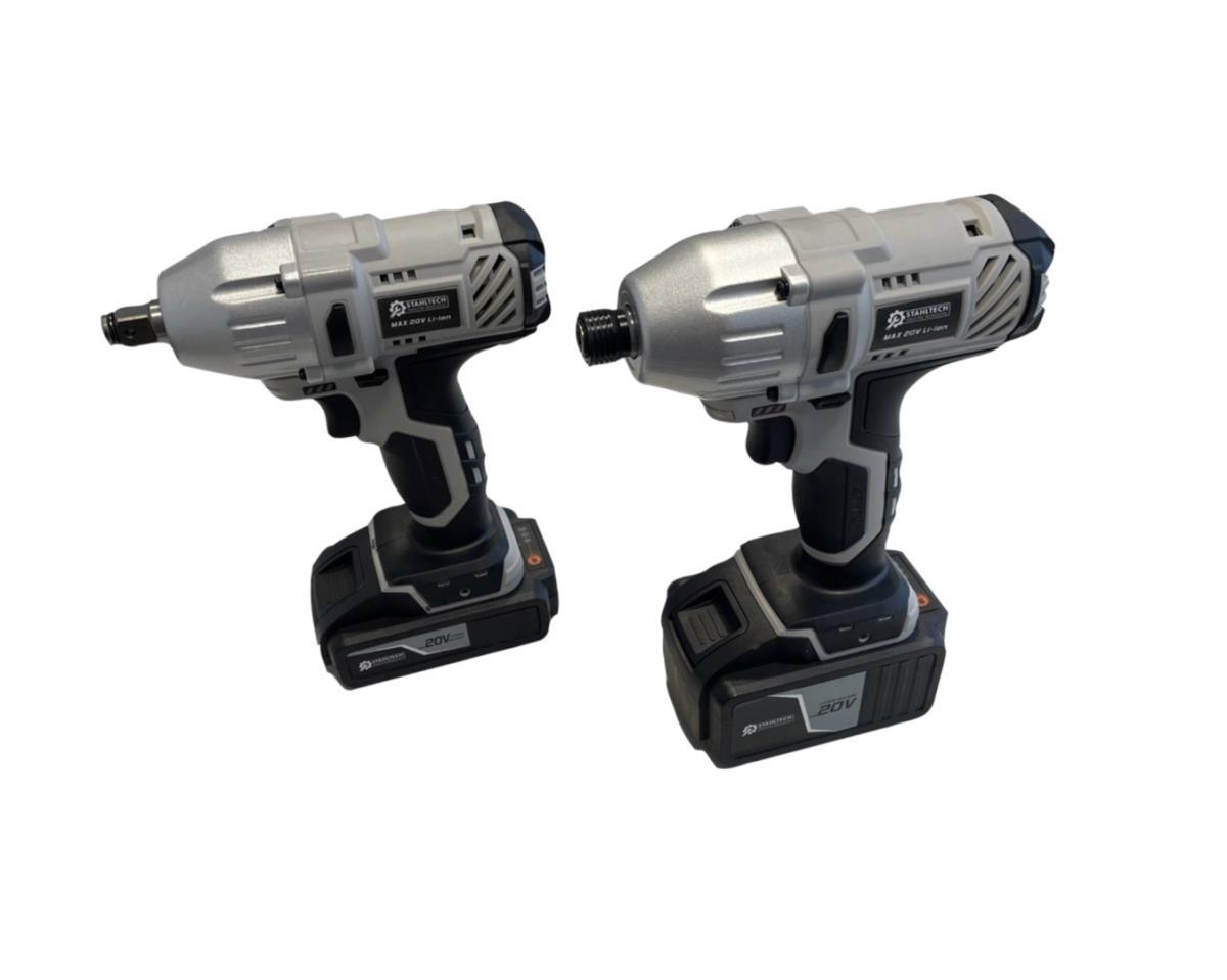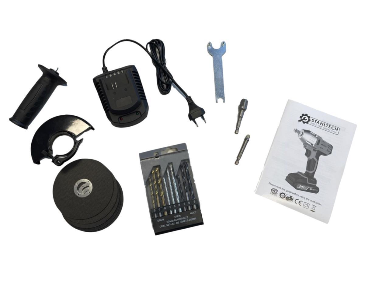 4 mchines en toebehoren op gereedschapstray; past in Gereedschapswagen; inhoud: 1 x slagmoersleutel 1/2” model R8001; 1 x boormachine model R7002; 1 x slagschroefmachine 1/4” model R7201-1; 1 x haakse slijper model AP18-03; met snellader; 2 x Lithium 20 Volt accu (2.000 en 4.000 mAh); 5 x doorslijpschijf; 1 x 1/4” 65 mm ADA; 1 x 1/2” 73 mm ADA; 1 x sleutel spankop haakse slijpmachine; met handleiding; ongebruikt en verpakt