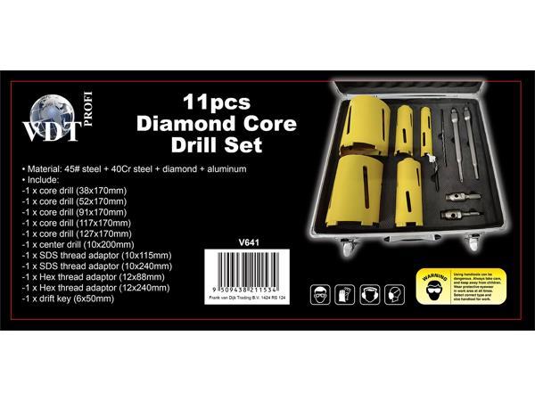 11 delig; tbv boren in beton en steen; SDS aansluitingen; 5 kernboor maten rond 38-127 mm; met adapters en centerboren; in luxe aluminium opbergkoffer met sloten en handvat; bouwjaar 2023; ongebruikt en verpakt