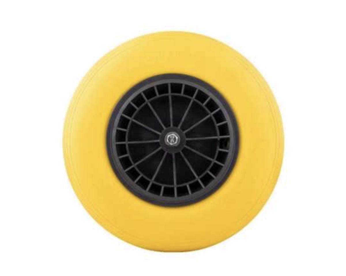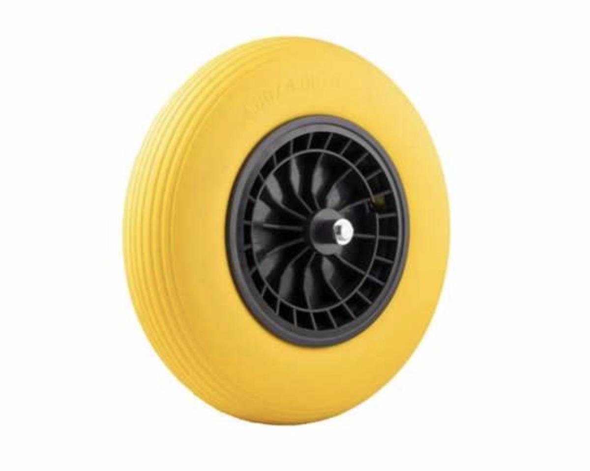 met gele PU band met donkergrijze velg; voorzien van rollager; band anti lek; asgat 20 mm; naaflengte 130 mm; voorzien van zijringen; inclusief as 130 mm; ongebruikt