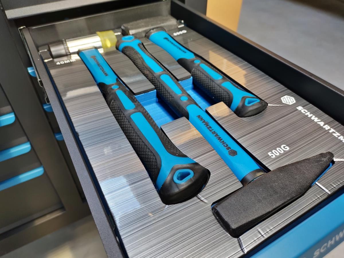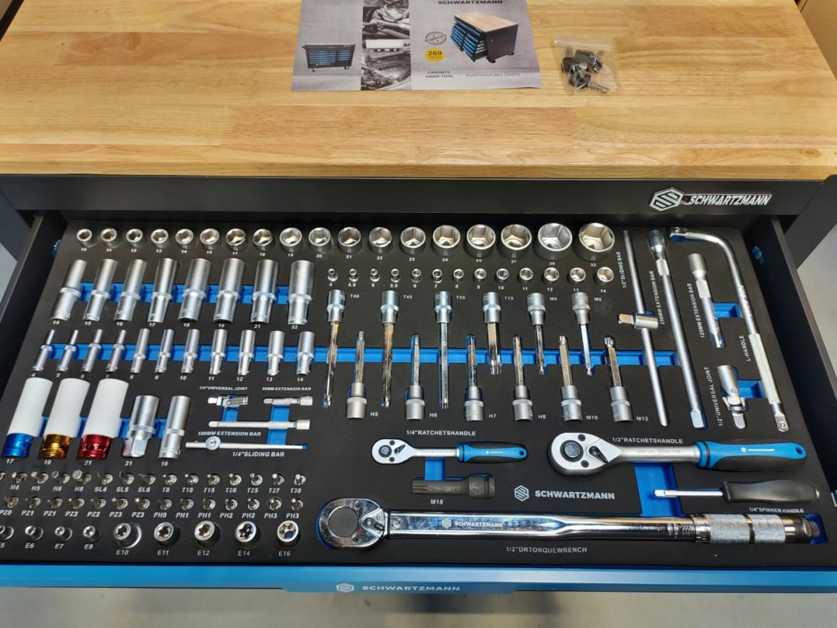 Unieke grote gereedschapswagen met 12 laden waarvan 10 laden gevuld met kwaliteits gereedschap, degelijke wagen met lades en wielen lopend op kogellagers, Houten bovenblad voor gebruik als werkbank, 1 meter breed,gewicht ca 120 kg, nieuw in doos