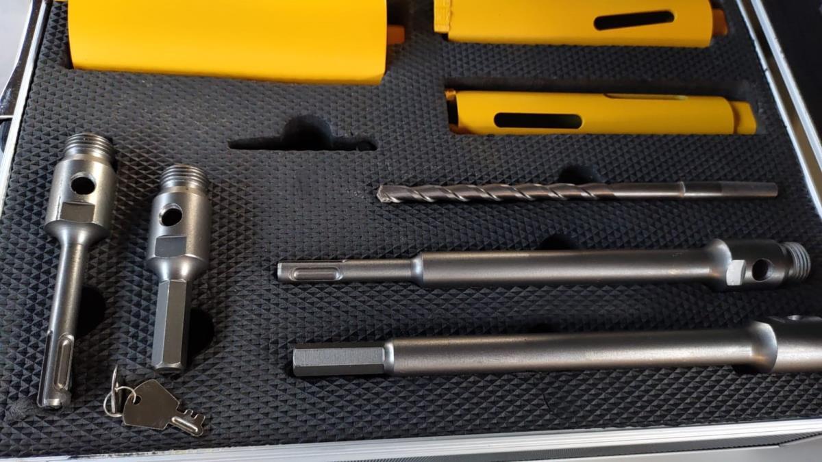 VDT kernborenset bestaat uit ‘Heavy-Duty’ stalen boren met diamant snijsegmenten. Voor het droog boren van nauwkeurige gaten in beton. Te gebruiken op boormachines met een veiligheidskoppeling. 5 kernboren (38, 52, 91, 117 en 127 mm) allen 170mm lang, 2 x korte en 2 x lange ashalzen (SDS-Plus en zeskant), geleideboor en uitwerpstift. De set wordt geleverd in een aluminium koffer.