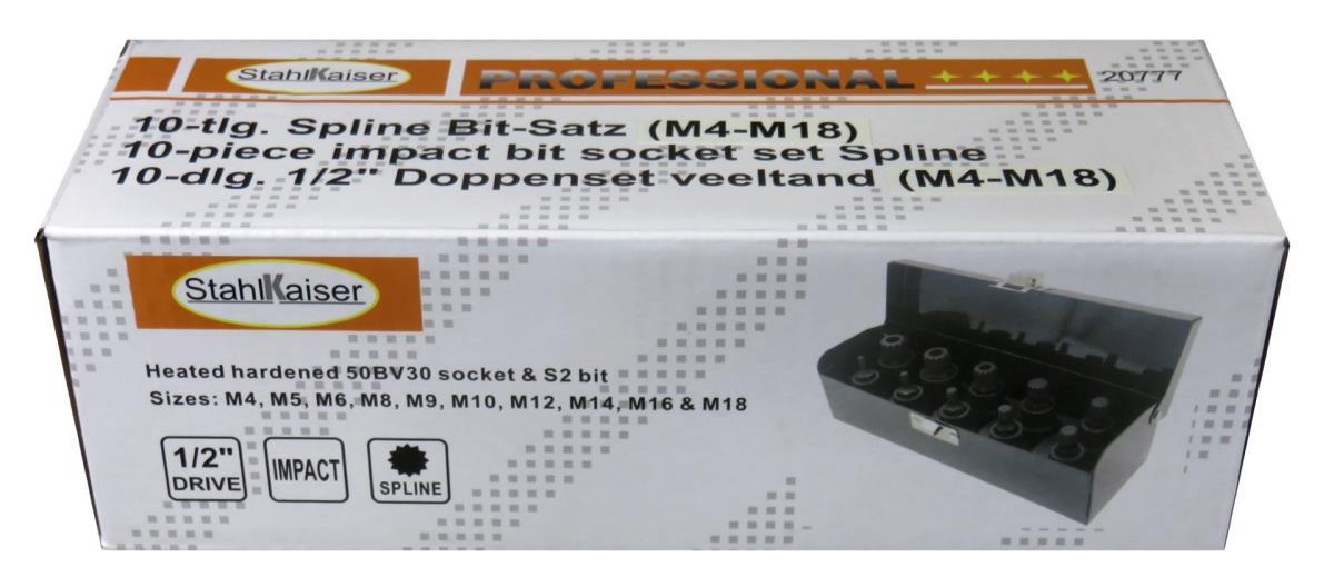 10 dlg veeltand krachtdoppen M4-M18 1/2", 10 dlg Torx krachtdoppen T20-T70 1/2", 10 dlg Inbus krachtdoppen H4-H19 1/2".