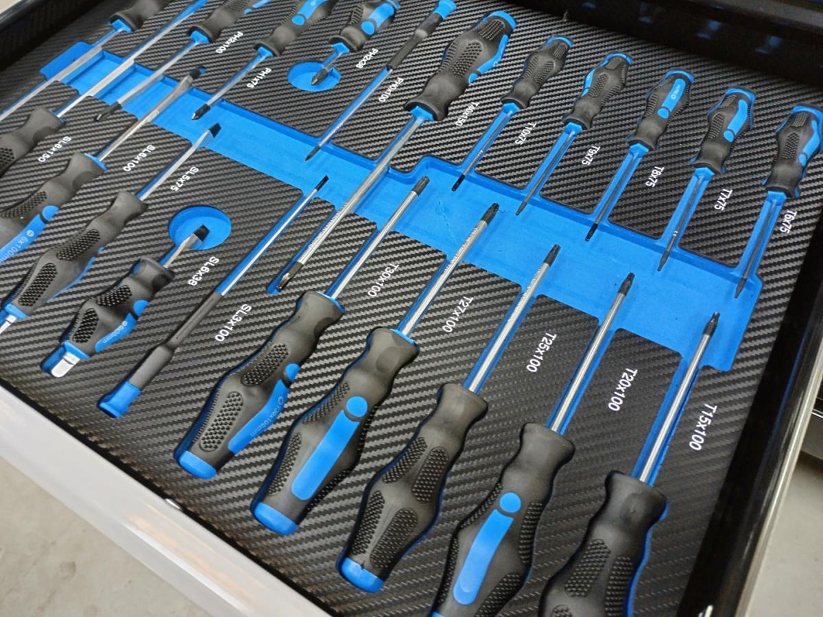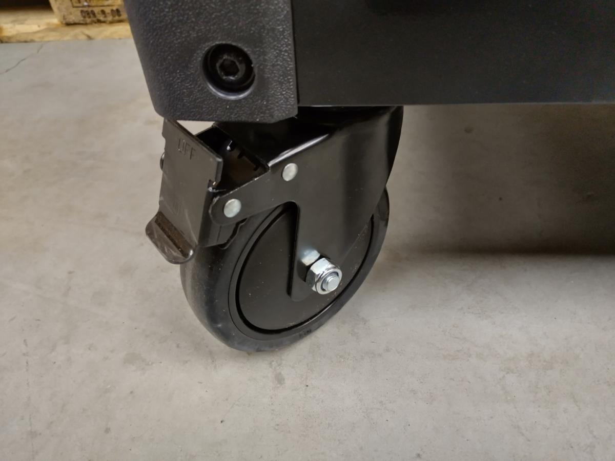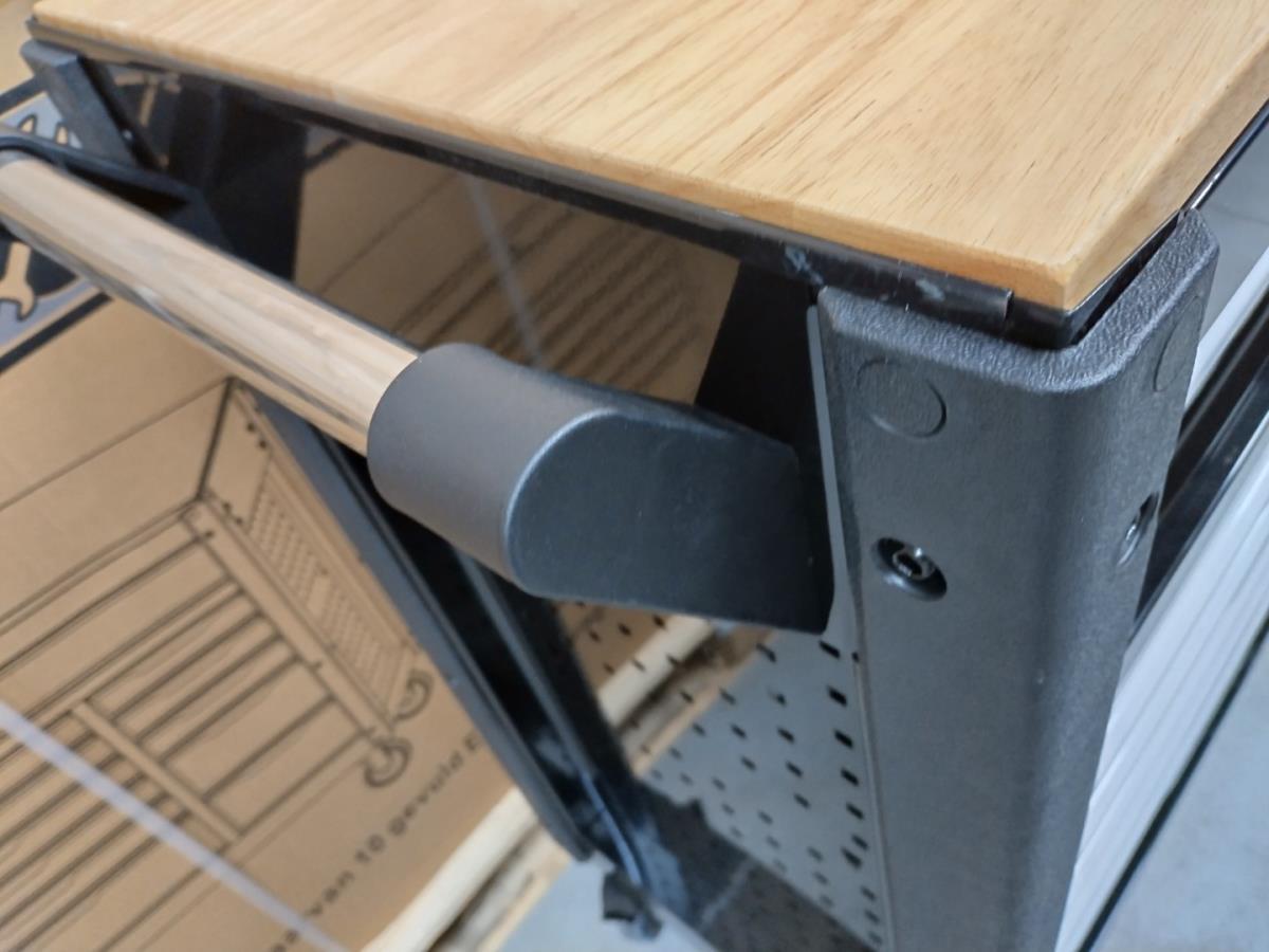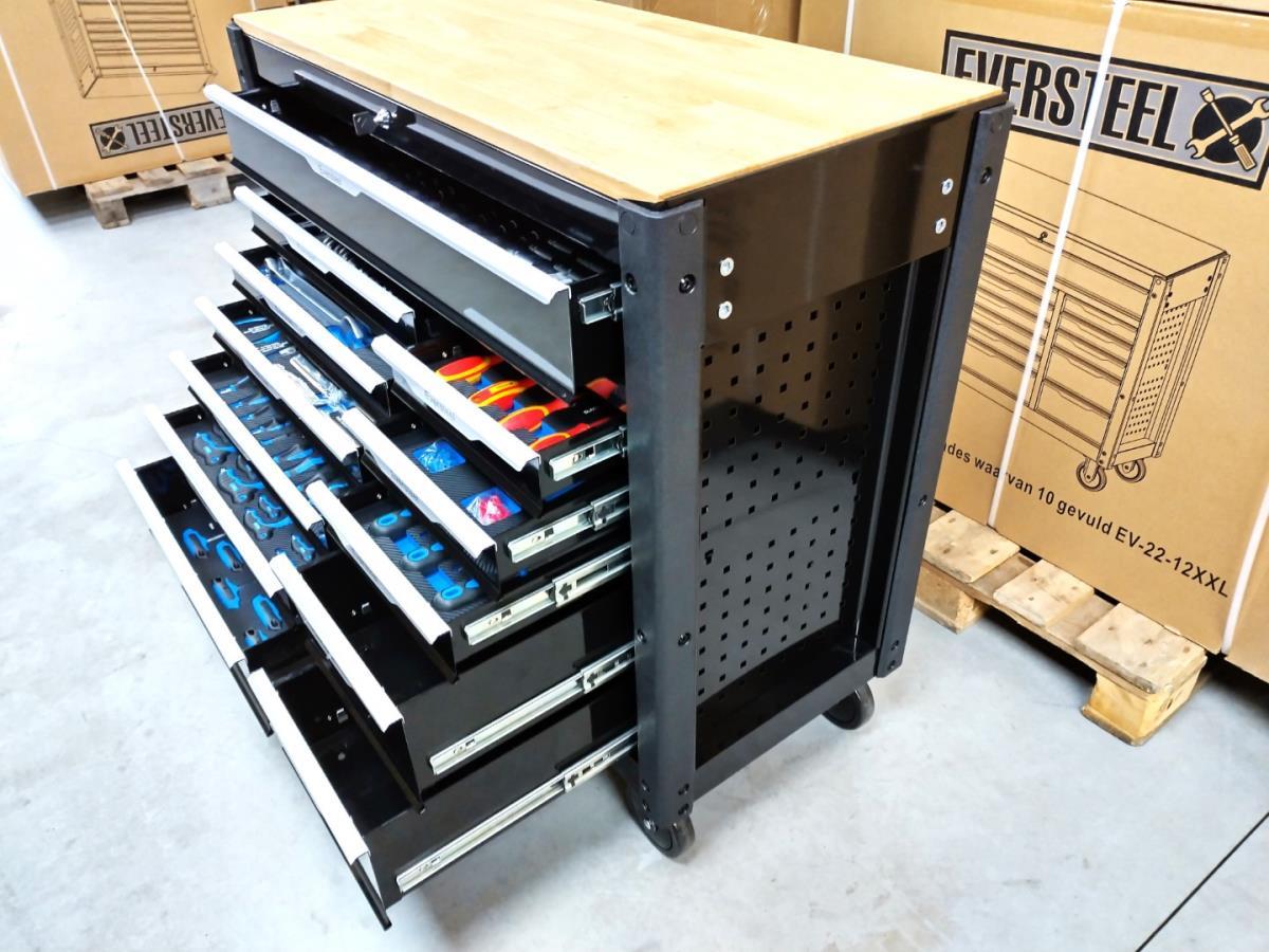 Unieke grote gereedschapswagen met 12 laden waarvan 10 laden gevuld met kwaliteits gereedschap, degelijke wagen met lades en wielen lopend op kogellagers, Houten bovenblad voor gebruik als werkbank, 1 meter breed,1 meter werkhoogte, kunstof bescherming aan randen, gewicht ca 120 kg, nieuw in doos