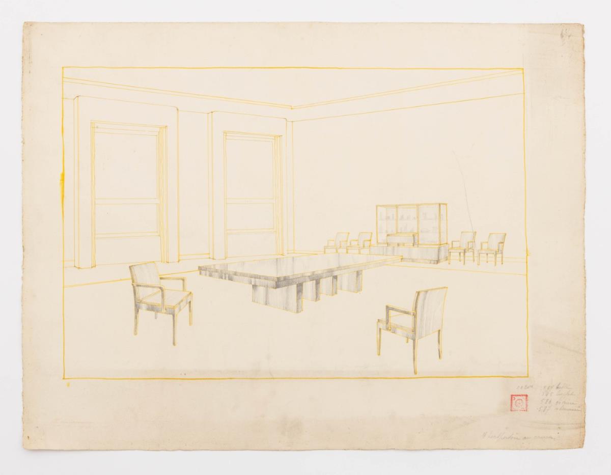 Origineel ontwerp voor eetkamer in interieur, gele inkt, potlood, atelierstempel, galerieprijs 1500