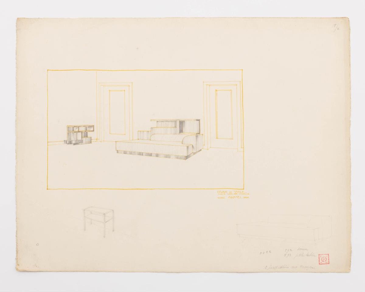 Origineel ontwerp voor eetkamer in interieur, gele inkt, potlood, atelierstempel, galerieprijs 1500