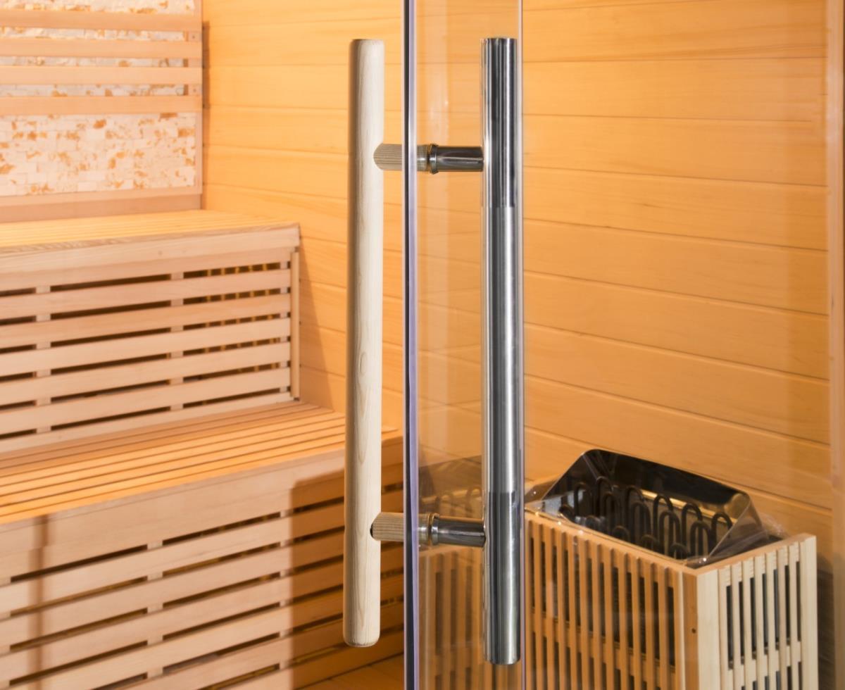 1x Luxueus ingerichte traditionele sauna; model: premium, 03, houtsoort: Canada hemlock, met led sfeer verlichting, vol glas voorkant 8 mm veiligheidsglas, rvs heather en digitaal controller, thermometer en hygrometer, glazen timer, lava steen, geschikt voor 5-6 personen, Uitsluitend samgensteld uit de beste materialen, afm: 220x200x210cm (l x b x h). ongebruikt