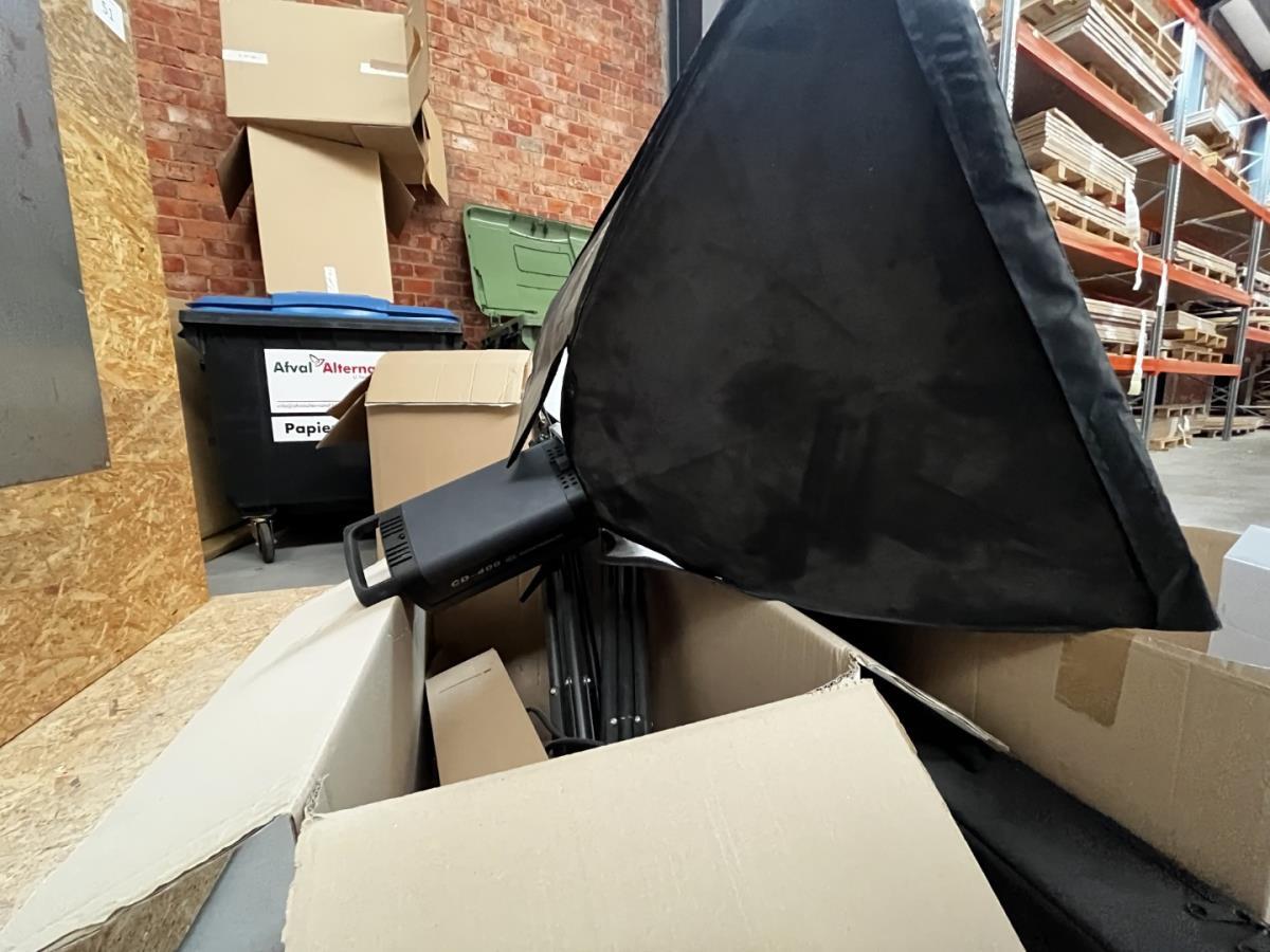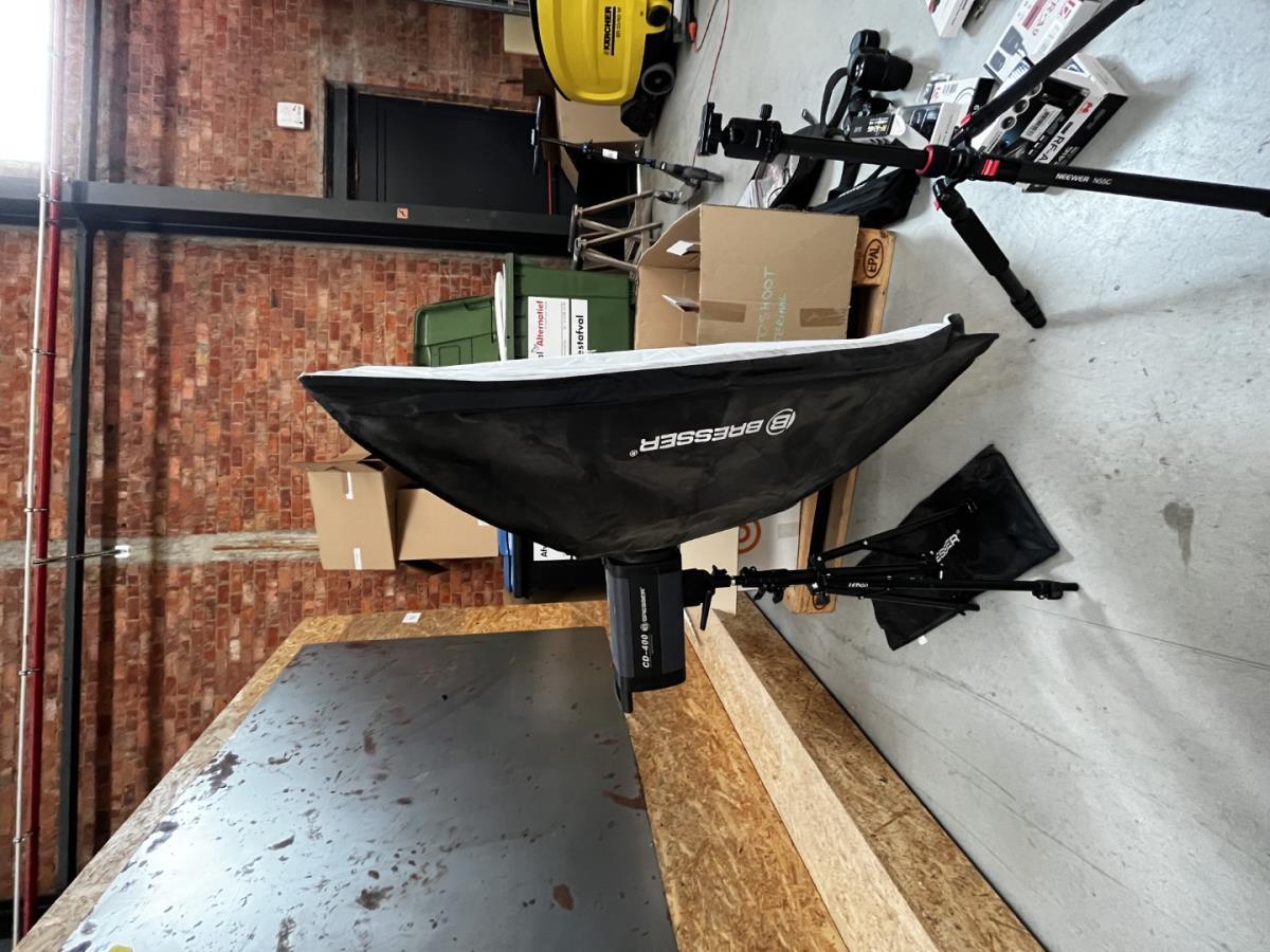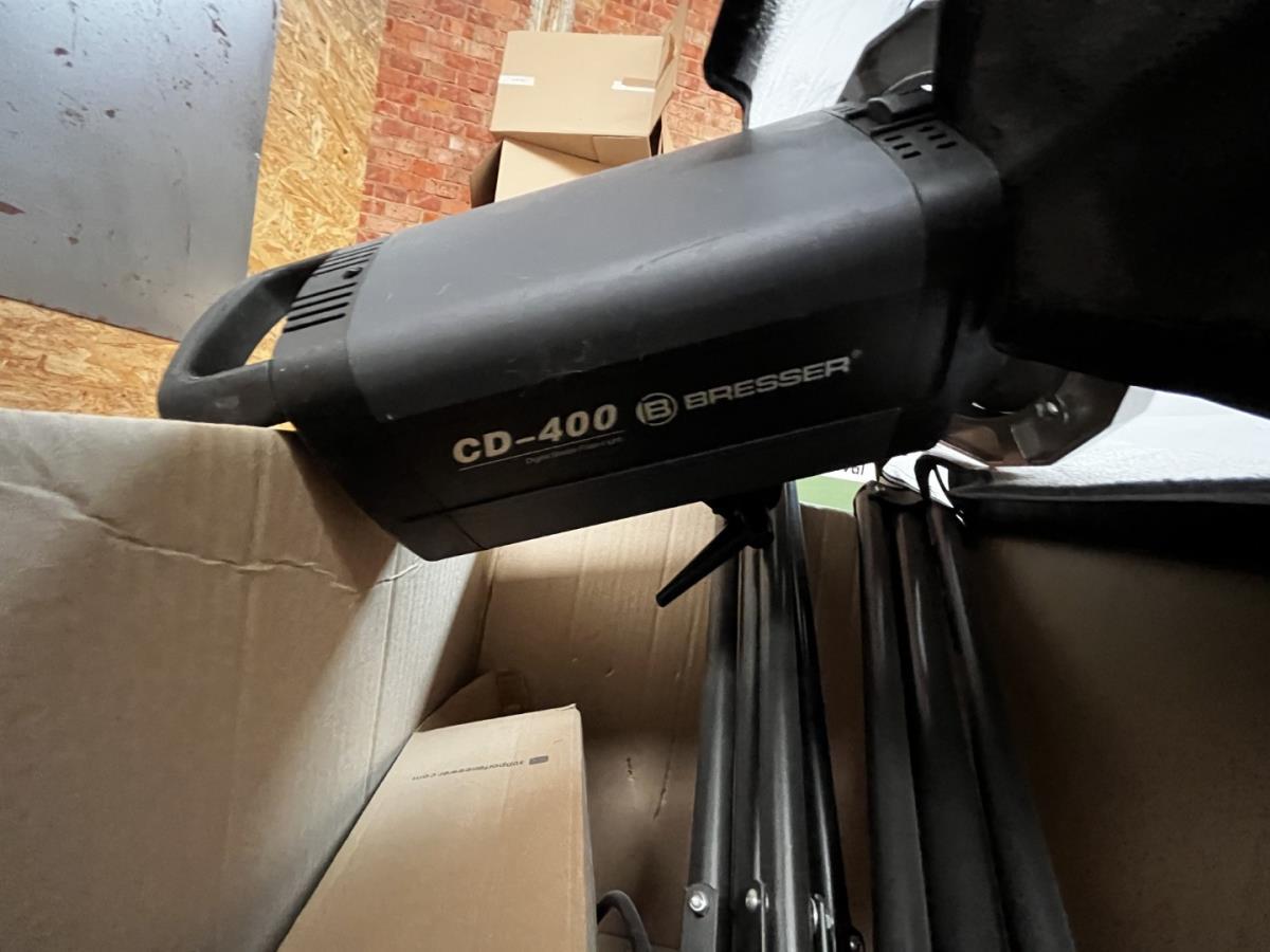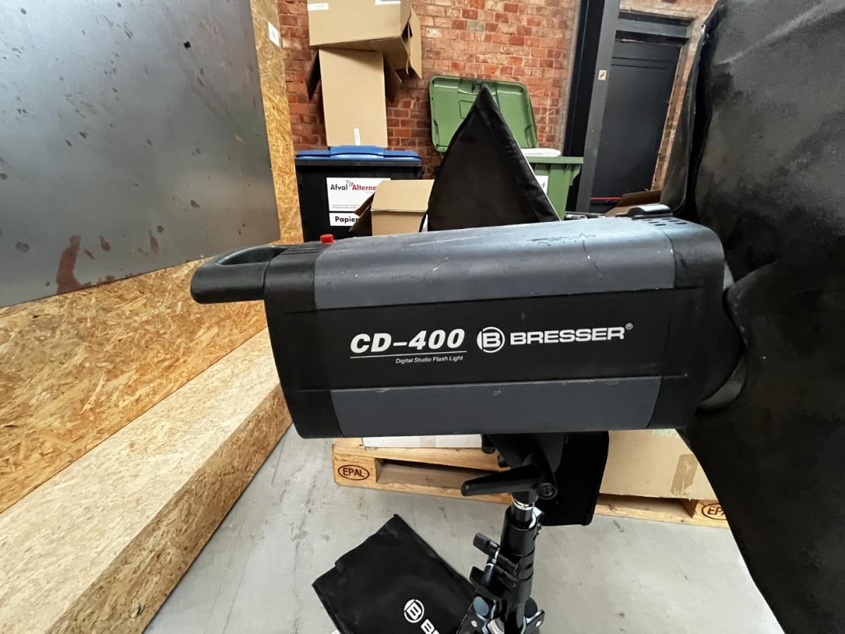 bu 2 spots BRESSER CD-400 met statieven + 3 losse statieven, div lenzen, flashtriggers, ea, allen in houten kist