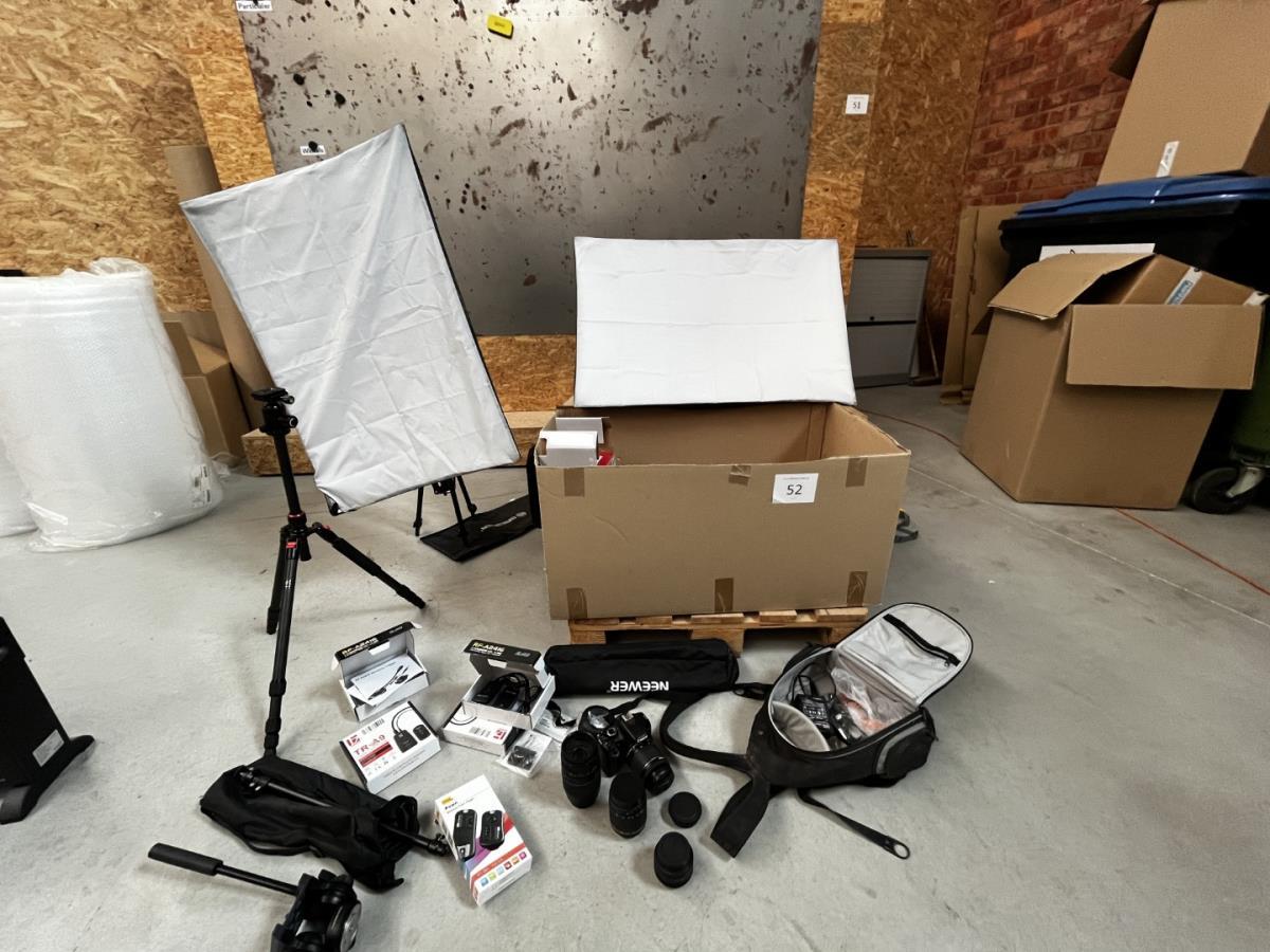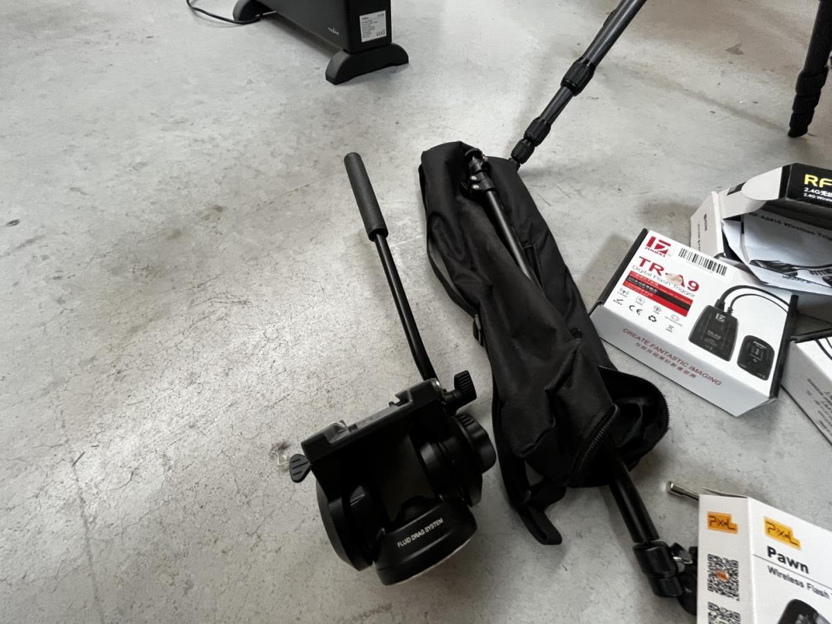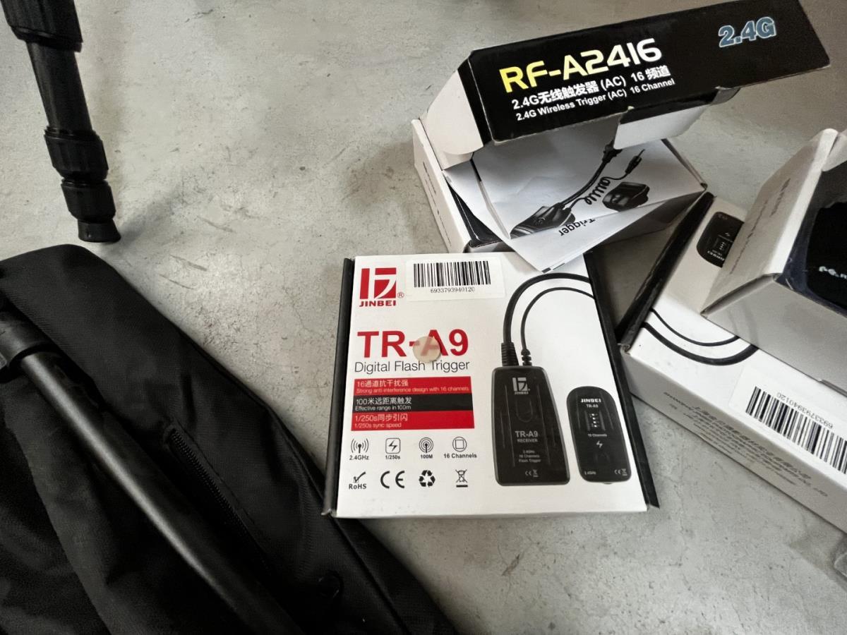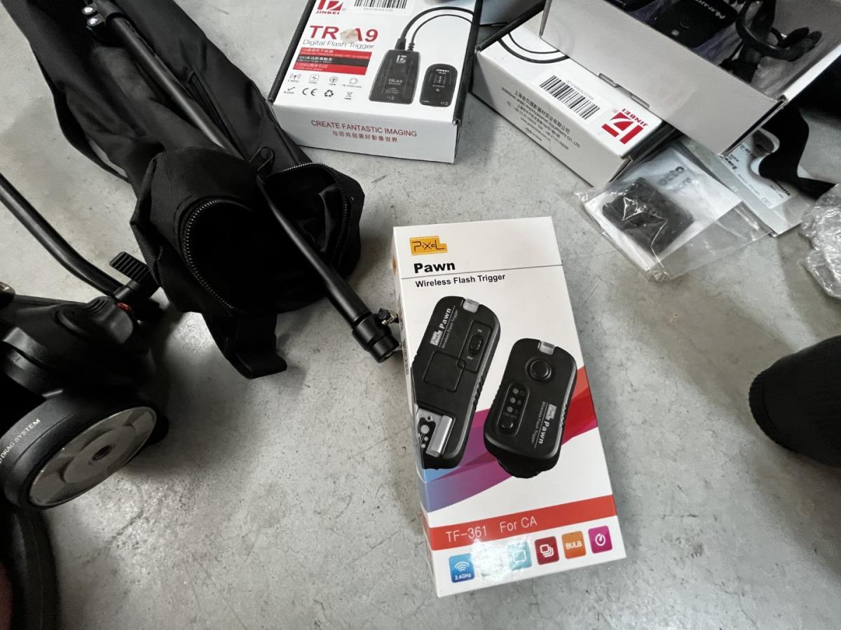bu 2 spots BRESSER CD-400 met statieven + 3 losse statieven, div lenzen, flashtriggers, ea, allen in houten kist