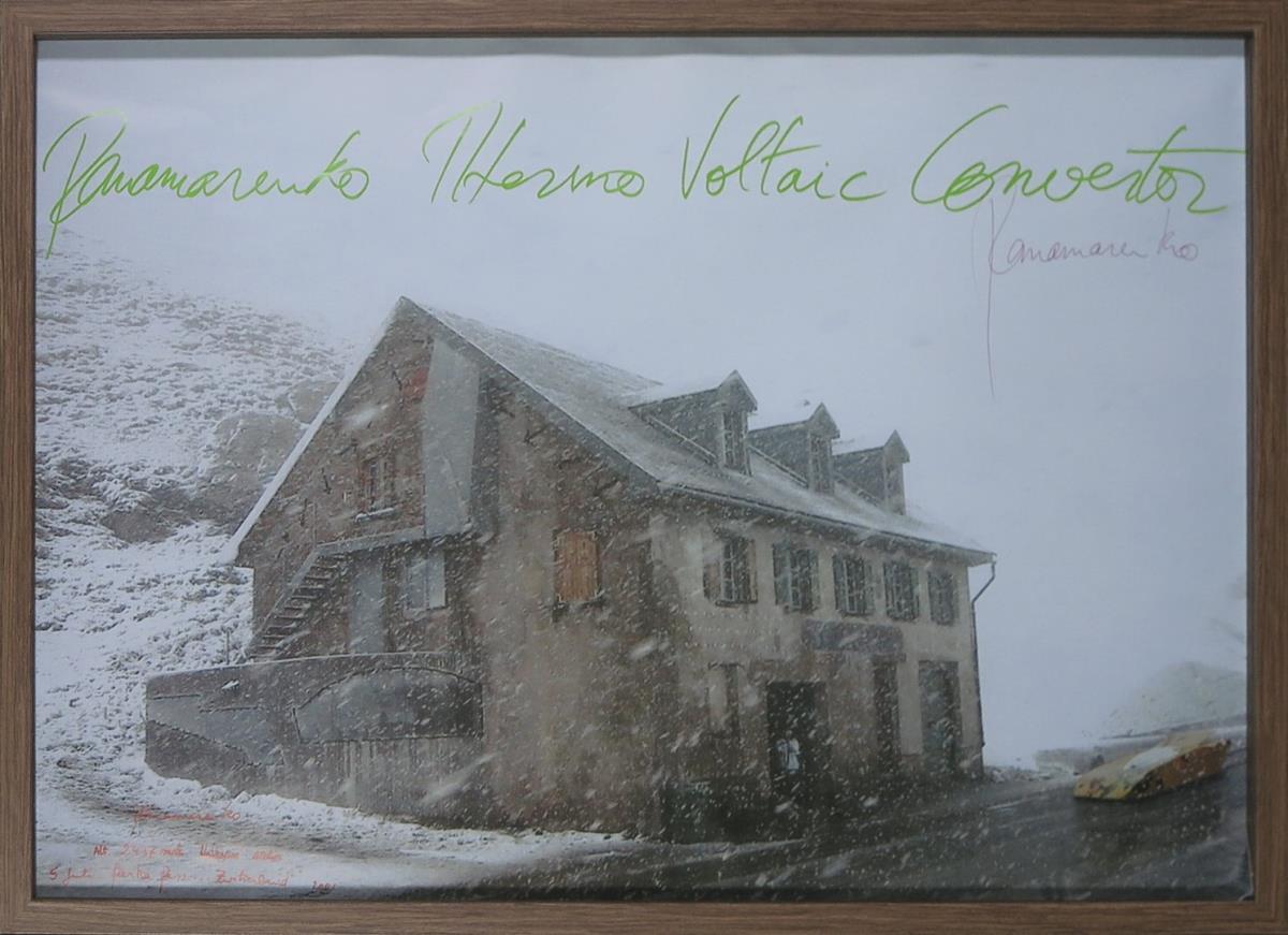 Op de afbeelding is het huis van Panamarenko in Zwitserland te zien en zijn wagen de Thermo Voltaic Energy Convertor