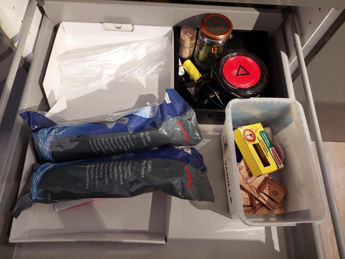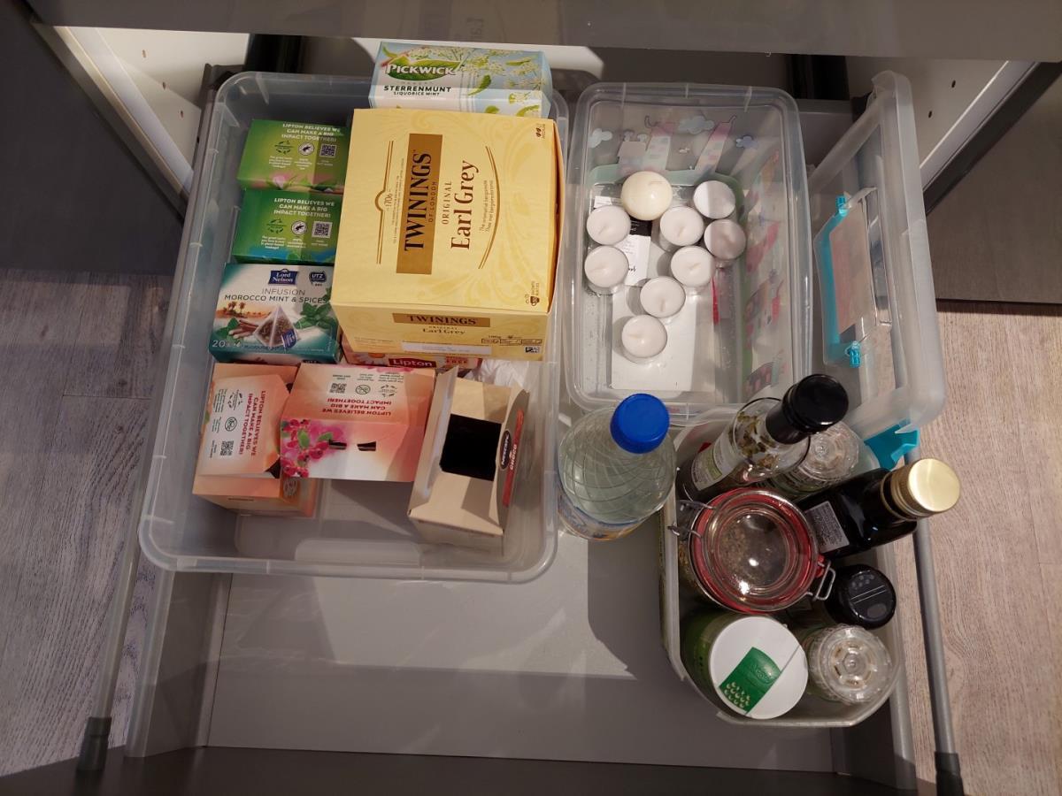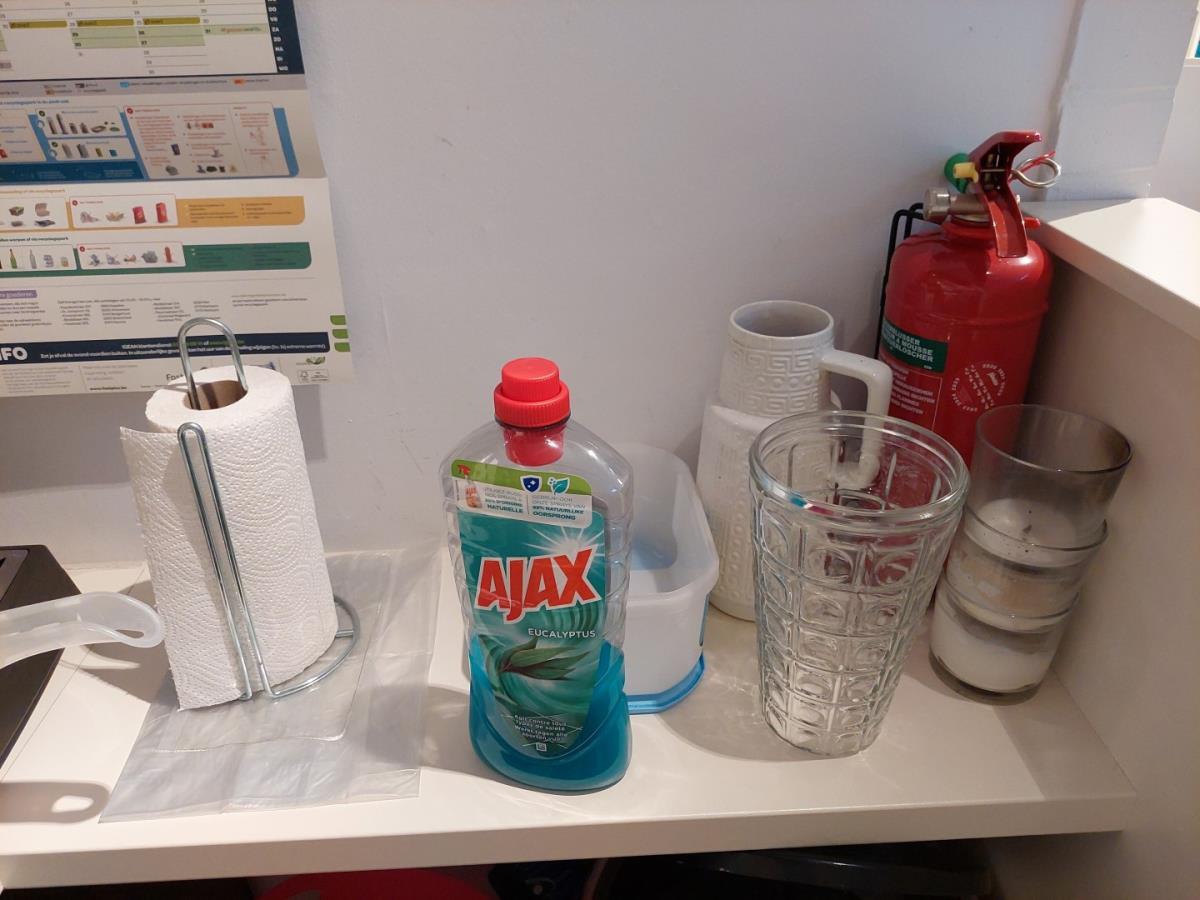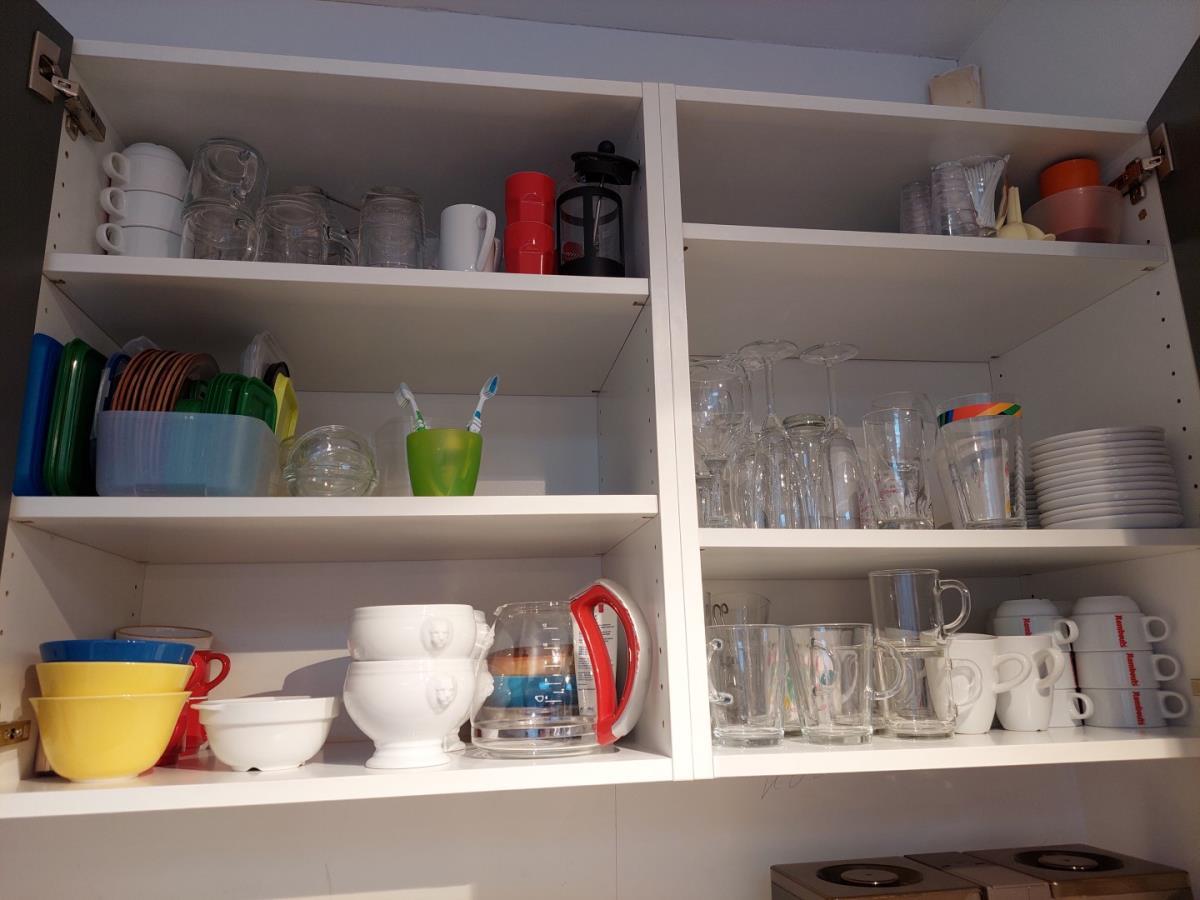 bu Servies, glazen, bestek, vuilbakken, inhoud ijskast, wasmand, poetsgerief…