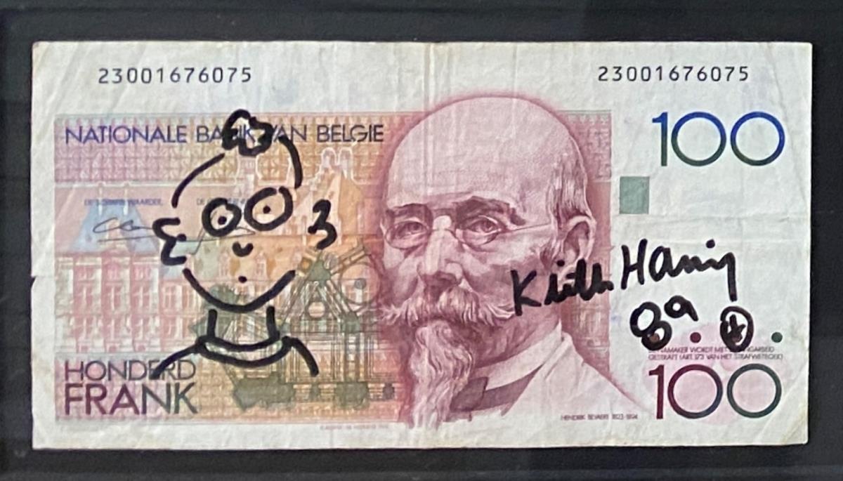 Originele tekening Keith Haring op 100 BEF biljet, geschatte waarde: 5500, afm plm: