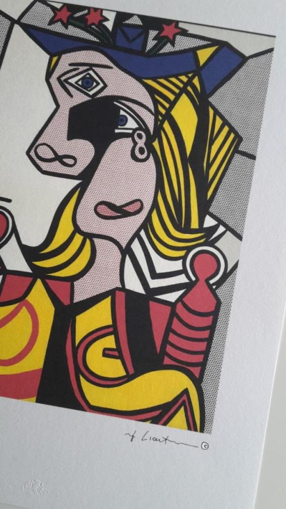 Kunstenaar: Roy Lichtenstein (1923-1997) Titel: Woman with Flowered Hat Roy Lichtenstein (after) naar het origineel uit 1963. Lithografie gesigneerd in de plaat en genummerd 42/150. Reliëfstempel van de uitgever Styria Studio. Gecertificeerd met droogstempel Castelli Graphics achteraan. 35*50 cm Het werk is gebaseerd op een Pablo Picasso portret van Dora Maar. Dit werk wordt door de eigenaar opgestuurd, verzendingskosten België: € 25; Nederland/Frankrijk/Duitsland: € 30