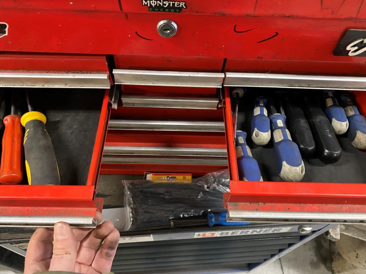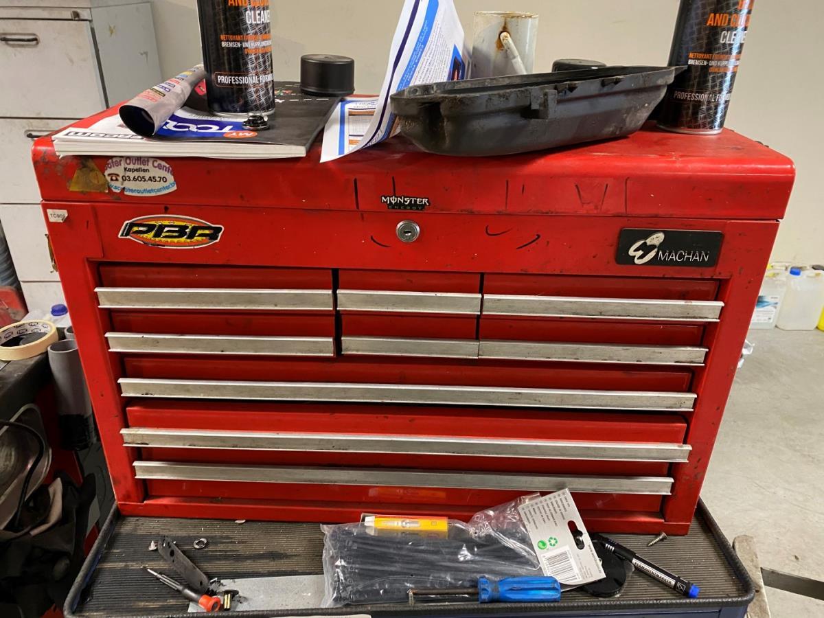vv 6 lades met inhoud wo; doppensleutelsets, tangen, steeksleutels, schroevendraaiers, inbussleutels, handgereedschap, accu haakse slijper BERNER BACA GBL 18 V, accu slagmoersleutel BERNER BACIW 18V, accu slagschroefmachine BACIS-1, ... + gereedschapskastje MACHAN met inhoud.
