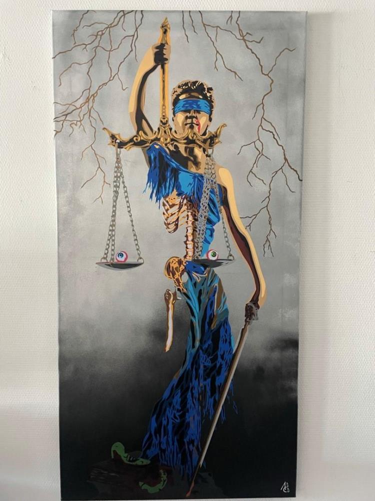 Het in vraag stellen van de rechtvaardigheid van het rechtssysteem en het vaak zeer lang aanslepen van dit proces. Geïnspireerd door BLM en hedendaagse moraliteitsvragen naar justitie toe. Voorbij het werk wandelen verandert de lichtinval wat een speciaal bliksem effect creëert.