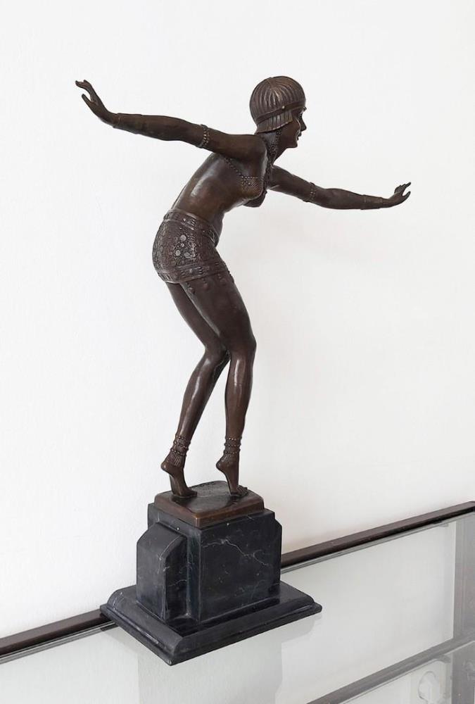 This is a fantastic quality bronze sculpture of an Art Deco dancing lady. This large heavy bronze is entitled ‘Phoenician Dancer’ and was sculpted by Demetre Chiparus. Chiparus’ work was heavily influenced in the 1920s by the art of ancient Egypt and the unveiling of King Tutankhamen tomb. You can see the creativity and the inspiration of the Egyptian art in this piece. She extends her arms out and poses in a theatrical pose. She stands on her toes and dances with her legs close together and bent. This is an extremely detailed piece right down to the tone of her stomach muscles. This sculpture was handmade and has a brown patina. It is mounted on an art deco styled black marble base.