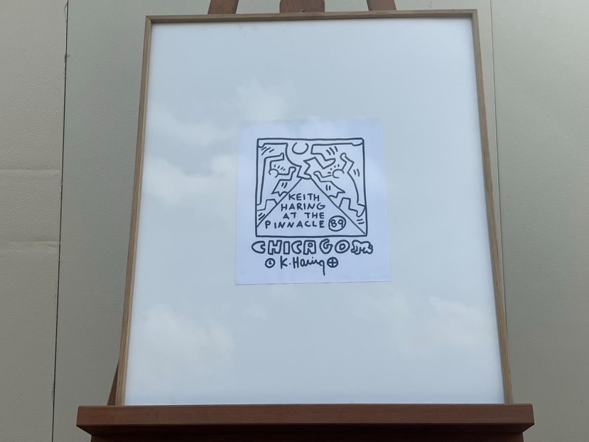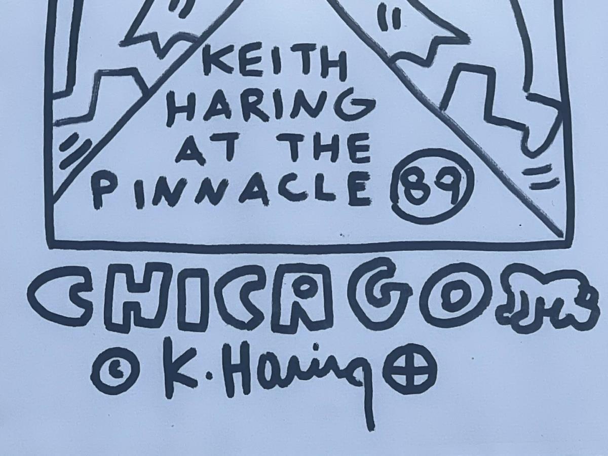 grey/black felt op paper, "chicago" keith haring at the pinaccle, signed, afm plm 25,4x21,4cm, certificate Angel Hortiz