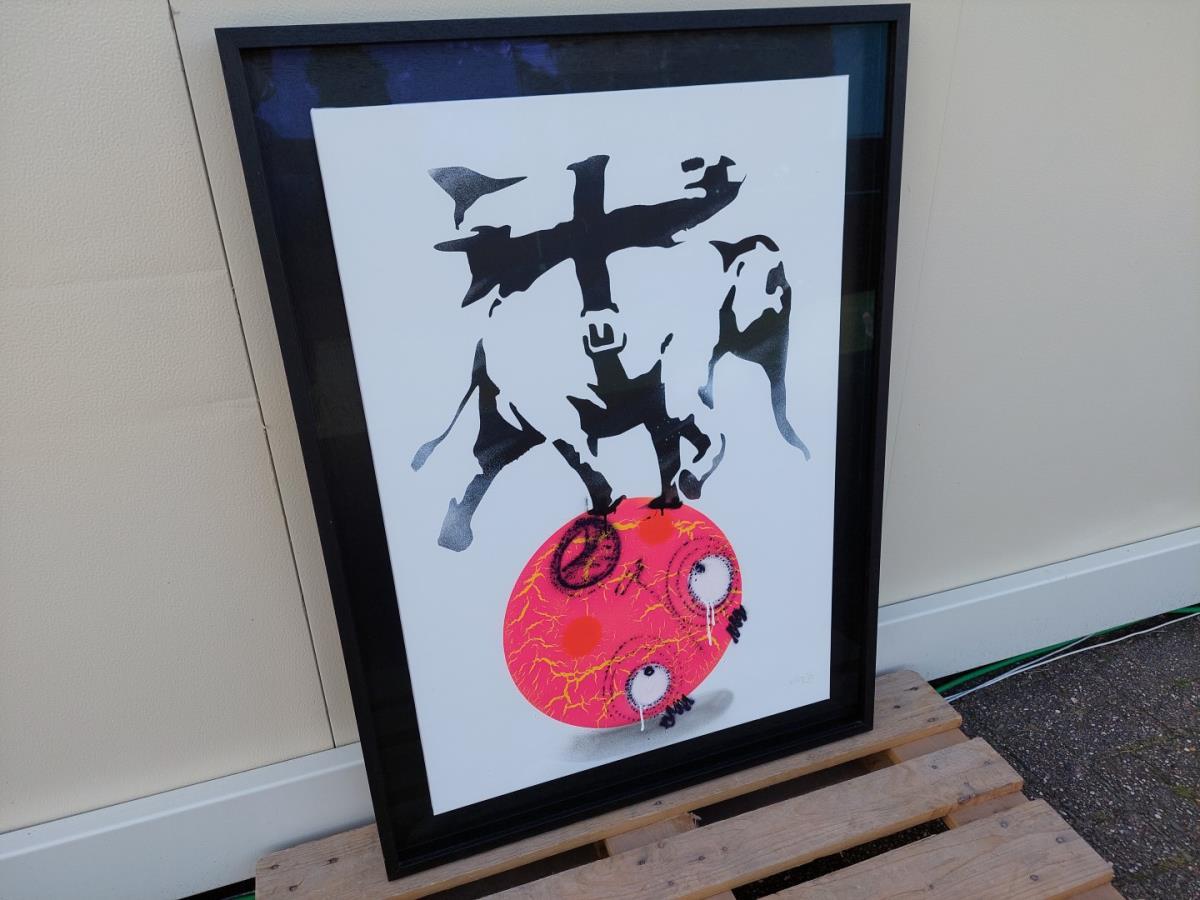 - Origineel Graffitikunstwerk gemaakt met stencil op canvas, spuitbussen, mixed media en een geheim liefdeselement op katoen.