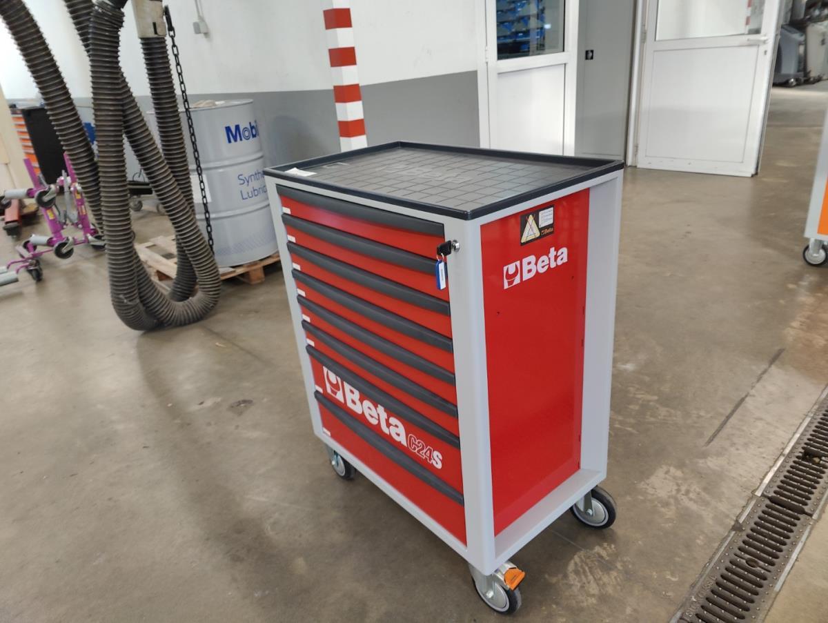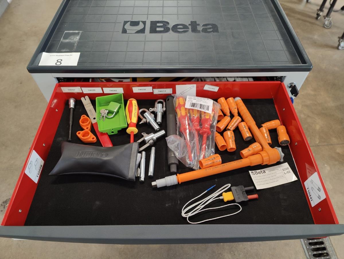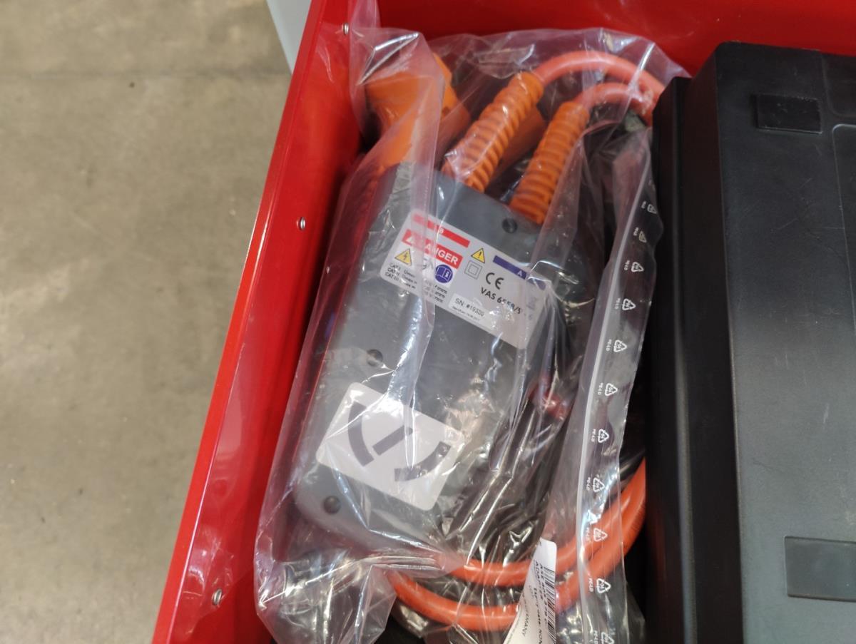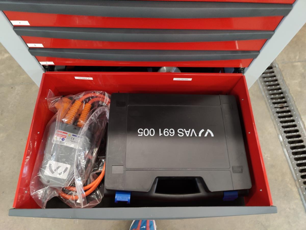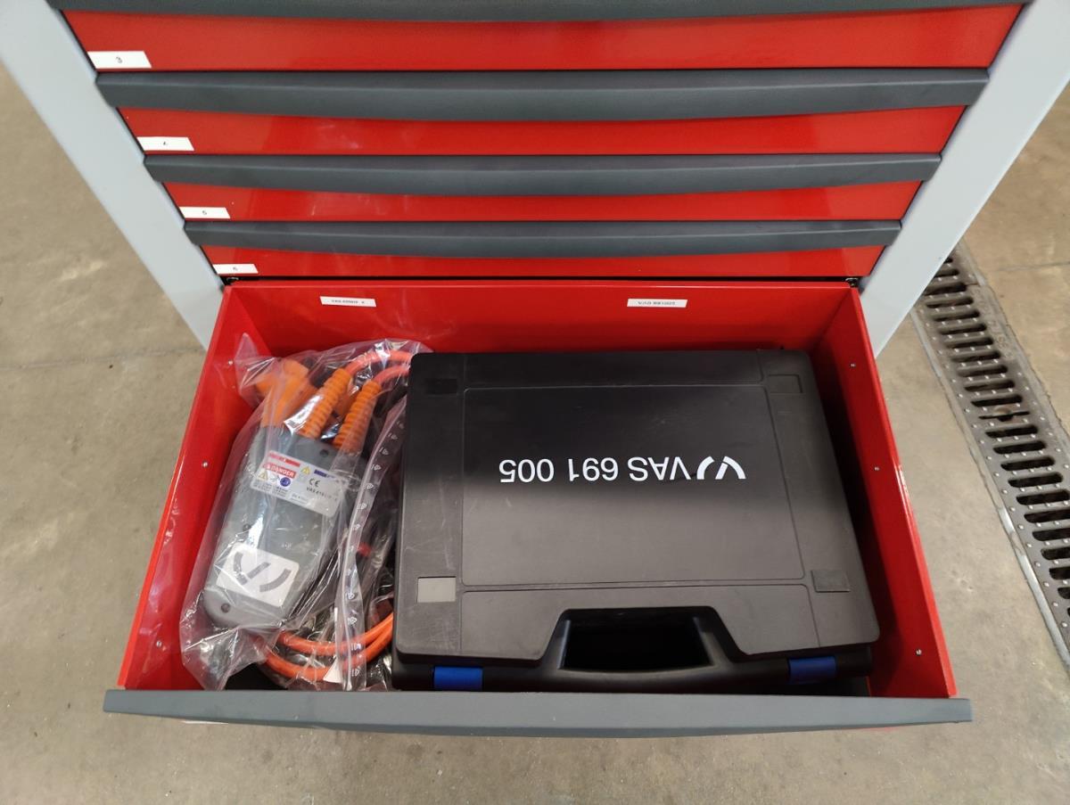 Voorzien van 7 gevulde laden inhoudende diagnose toebehoren, handgereedschap en veiligheidsmateriaal.