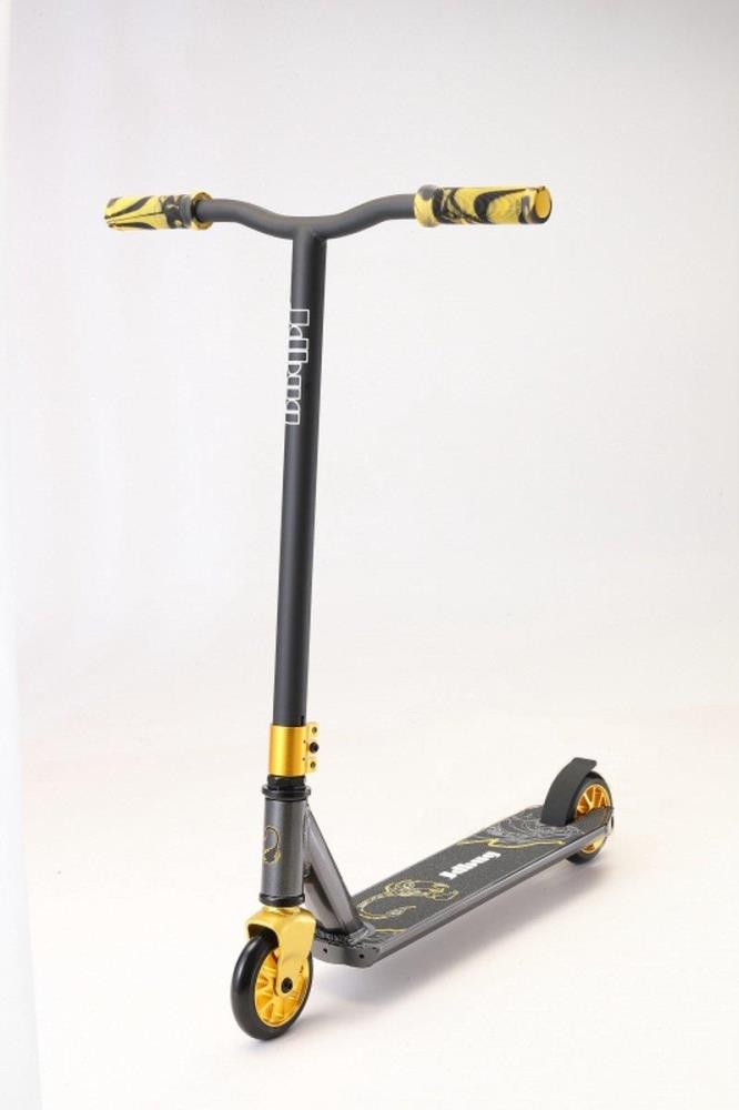 1 x JD Bug Freestyle Stunt Scooter 119T Yellow Voor de beginnende stuntsteppers is er deze JD Bug step uit de serie 119T. Voor de 7-8 jarige sportievelingen is deze step ideaal. De step is sterk en gemaakt van aluminium met een T-curved stuur met pro BMX handvatten. Op het achterwiel zit een stalen rem. De sterke wielen bevatten een aluminium kern met een PU rijvlak. Ga lekker naar buiten oefenen in het skatepark, want voor u het weet ben je een echte stuntman/-vrouw! Kleur: Zwart/geel Gewicht: 3,6 kg Materiaal: Aluminium Wieltype: Polyurethaan Stuurhoogte: 107 cm Draagvermogen: maximum 100 kg Inhoud: 1 stuk - Sterke velgen - Vering in voorvork - Sterk aluminium frame - Voetrem op achterwiel - Eenvoudig mee te nemen - Gemakkelijk vouwsysteem