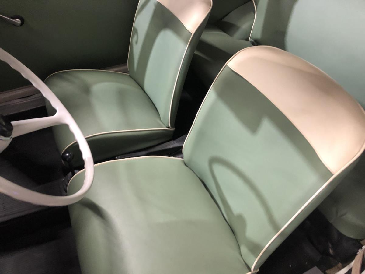 Deze Fiat uit 1964 is volledig gerestaureerd en is in een mooie combinatie van beige lak en pistache groen en beige interieur. Zelfs het chassis en de binnenwielkasten staan volledig in de nieuwe lak.