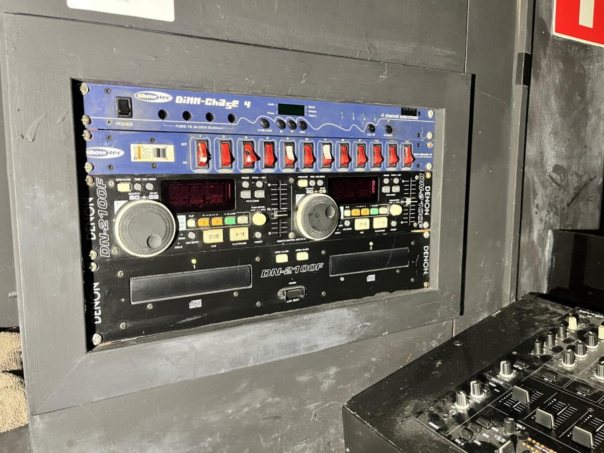 Bu SHOWTEC DIMMCHASE-4, BEHRINGER dj mixer, DENNON CD SPELER, vollediger pc, 4 EV luidsprekers, blacklights etc