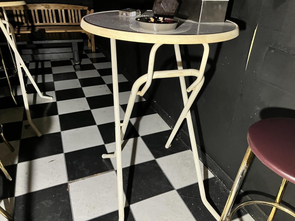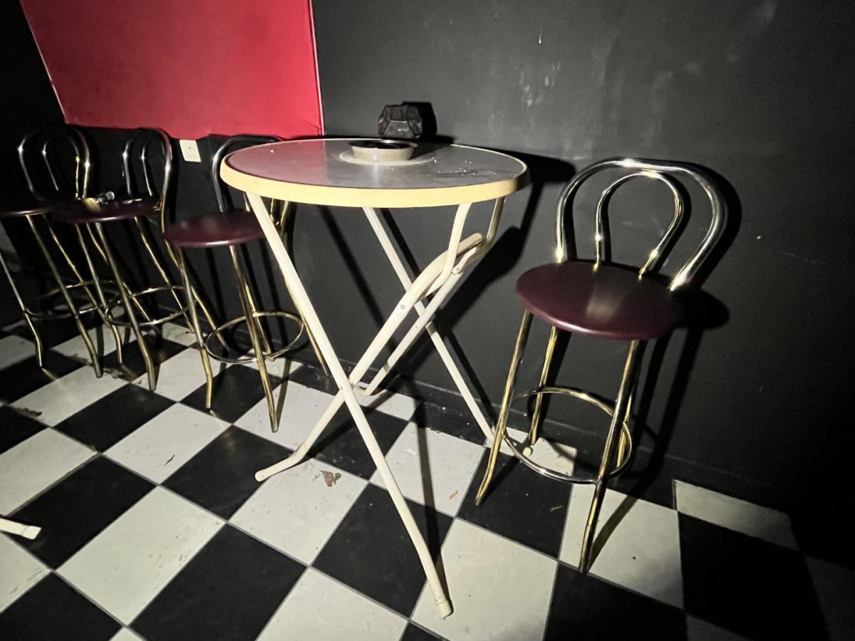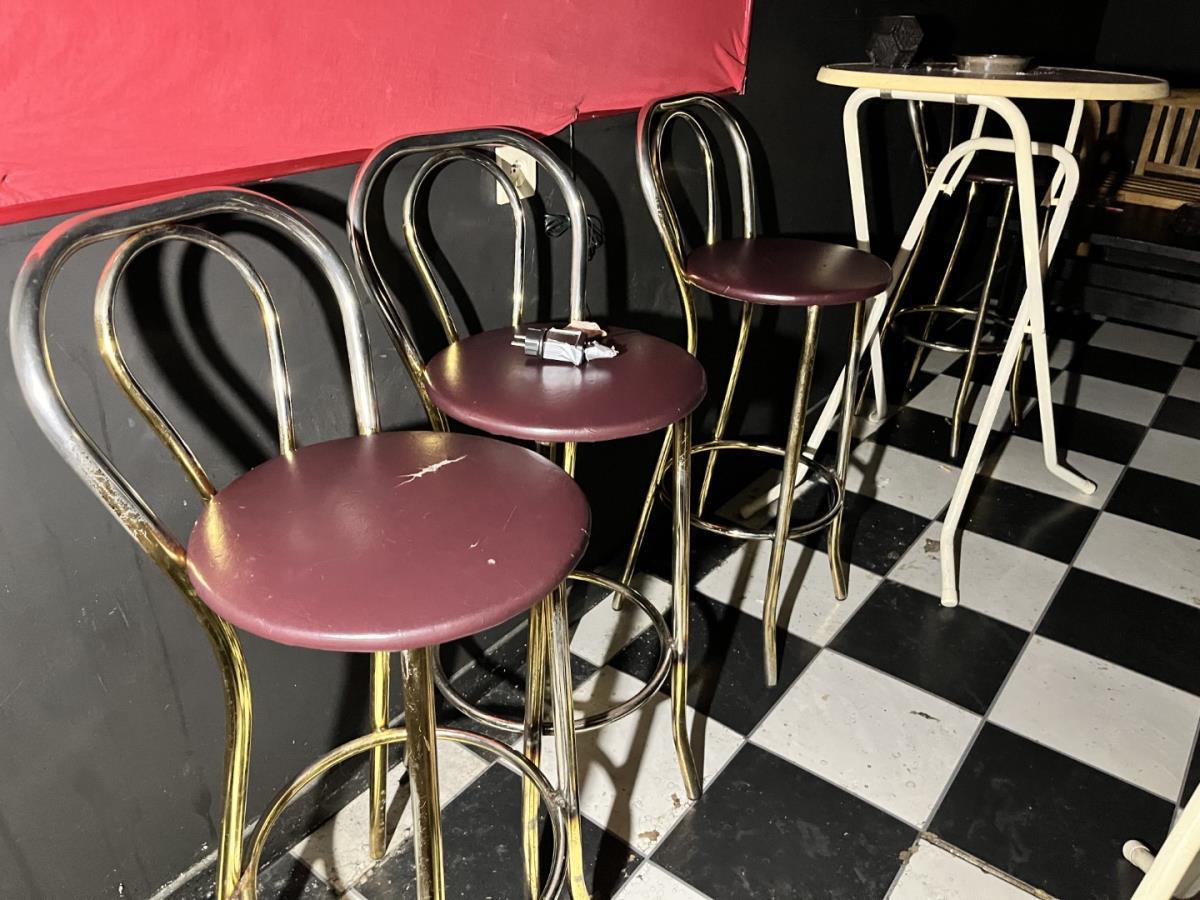 Bu barkrukken, staantafel, houten zitbank en salontafel