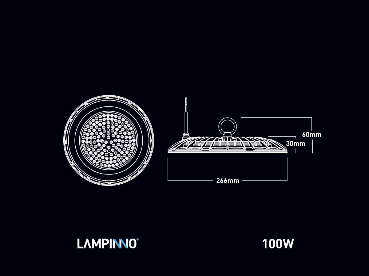 6 x 100 watt LED UFO Highbay SLIM Design Waterdicht 3000K - lichtstroom 10000 lumen SMD LED - met lens - lichtkleur warm wit 3000K - waterdicht IP65 - Lineaire IC driver inbegrepen - flicker free - stralingshoek 90° - product kleur zand zwart - diam Ø 266 x 30mm - materiaal aluminum en PC lens - bevestigingsset niet inclusief - levensduur 25000 uren - voltage 200-240V - het kan in watt en lumen 5% verschil tonen - sku 1015