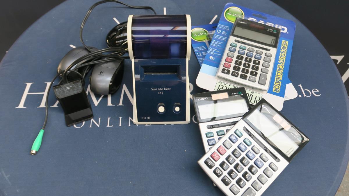 WO 4 casio calculators, 1 smartlable printer sii450,logitech receiver en 3 muizen