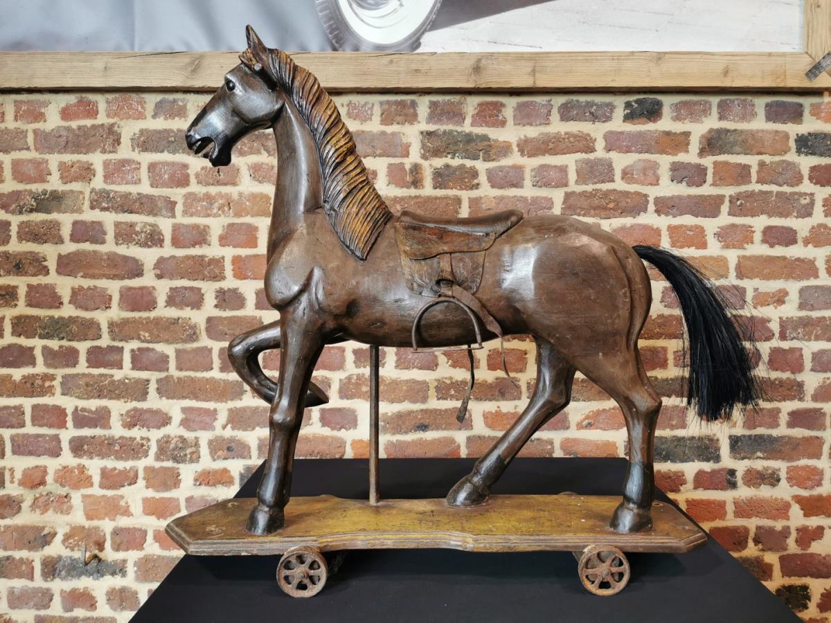 Kavelnummer 15: antiek houten paard op wieltjes