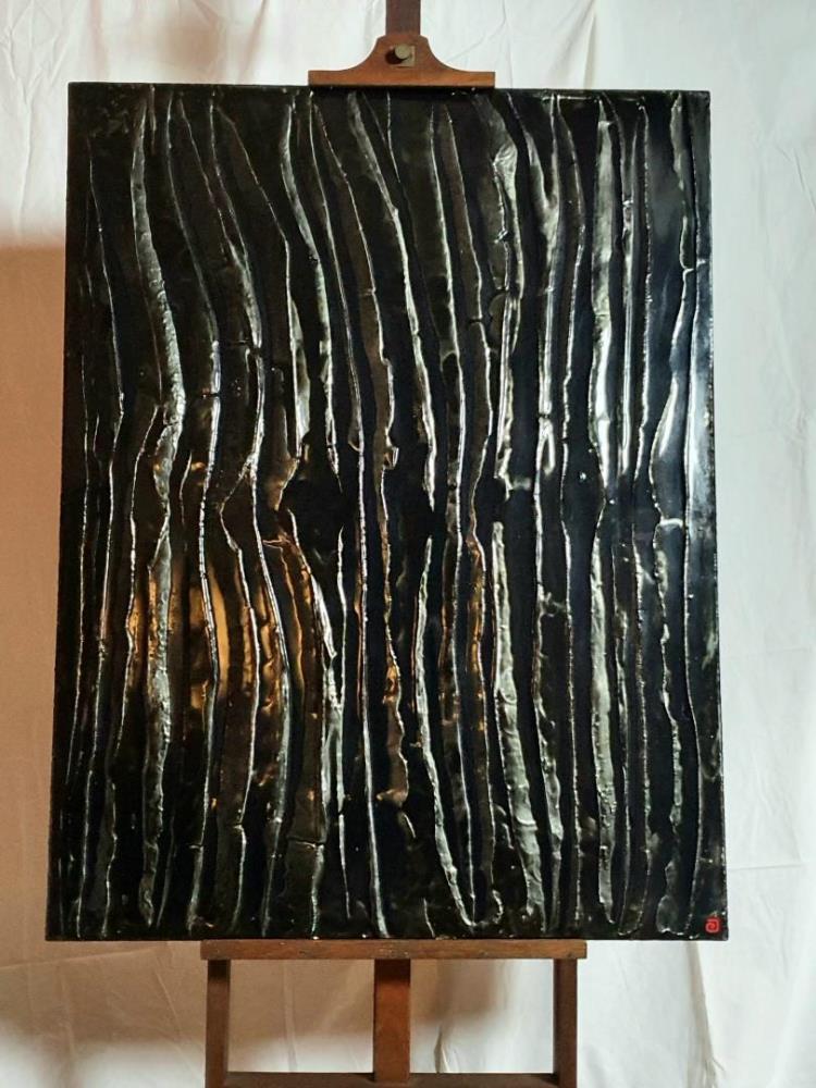 Een Fransman uit de Bourgogne. Gold, Blue, Silver en Metal Plate op doek. Jarenlang was Vincent Gild (°1974) muziekartiest en componist, maar hij vond zijn passie in figuratieve creaties. Repetitieve elektronische rock/punk wordt omgezet in visuele akoestiek op doek, in golvende harmonieuze bewegingen of krachtige explosies. Unieke werken om te ontdekken !Na een muzikale start in de jaren negentig vond Vincent Gild zijn passie in figuratieve creaties. Schijnbaar banale materialen zoals metaal bevrijdt hij van een rationele en oppervlakkige gedachte en schenkt hij de ruimte om hun mystieke en magische eigenschappen in volle kracht te ontladen.Zijn kunst brengt in het harde, industriële materiaal dat hij gebruikt, de natuur, het spontane en het organische terug. De grillige terroirs van de Bourgogne, waar hij woont en werkt, komen tot uiting in de keuze van zijn materialen en zetten aan tot solipsistische reflecties die weinig uitleg vragen. Zijn texturen spreken, fascineren, magnetiseren en trekken de aanschouwer als vanzelf in het werk: de dreunende aorta van de materialen in beeld(spraak) omgezet.Onder het pseudoniem “Vince” bracht Gild in 2004, op het label van Bob Sinclar, zijn eerste single 'Superworld' uit. Zoals een traag, hypnotiserend elektronummer zich ontwikkelt, zo lijken Gilds texturen ook het resultaat van een gestaag en organisch proces. Even vloeiend als een golf elektronische klank, tekenen de structuren van zijn werk zich af. Gild citeert Pierre Boulez, Steve Reich, Philipp Glass, Bernard Parmegiani en Pierre Henry als invloeden. Zij zijn allen pioniers van de hedendaagse klassieke en/of elektronische muziek. Wat zij in muziek trachten uit te drukken, tracht Gild in materie weer te geven: dense, meeslepende structuren, repetitieve golven, een soort verloren oerkracht.