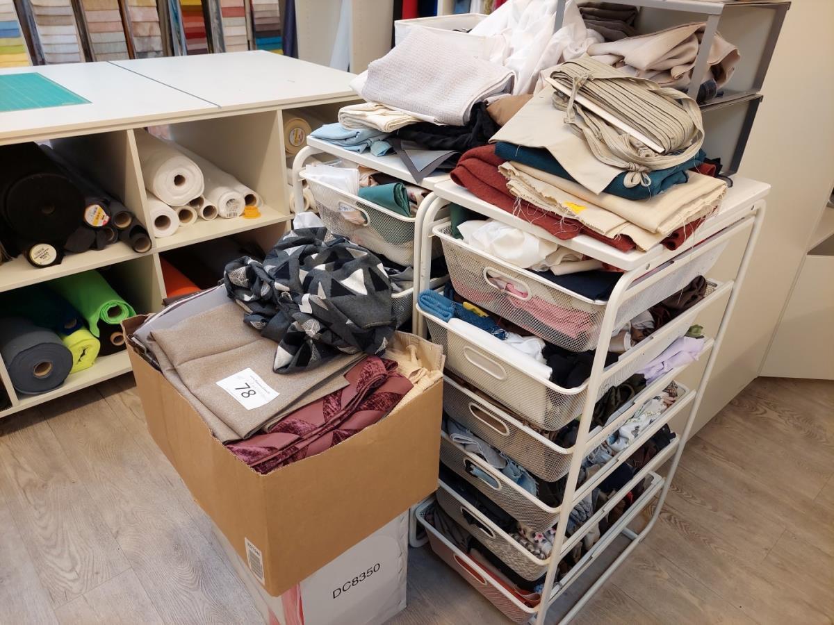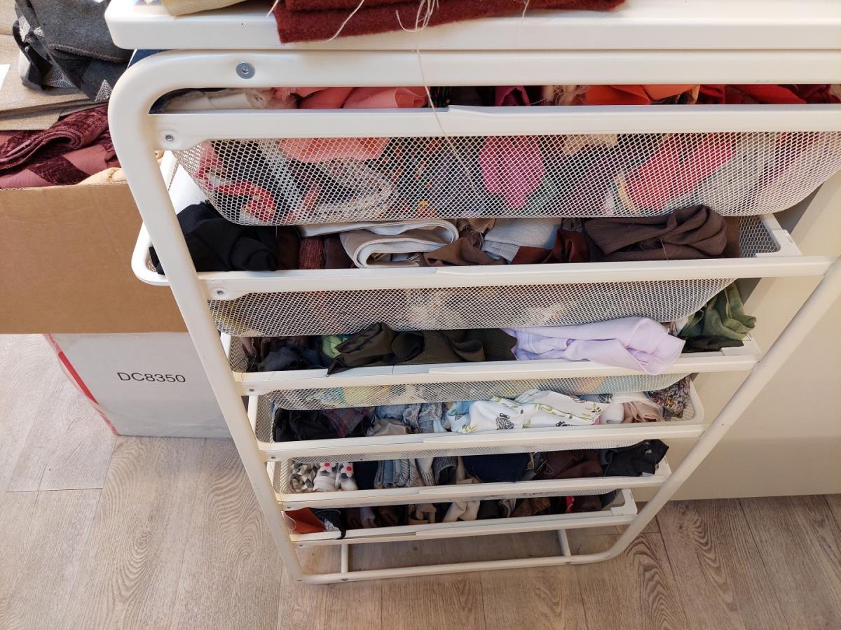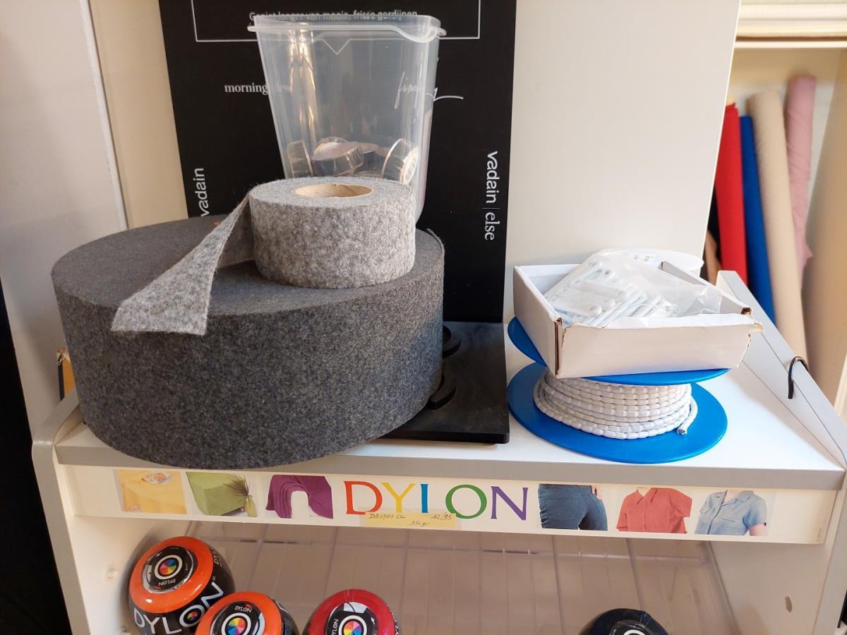 bu div overschotten stof, div bollen wol, DYLON kleding kleuring, zakken, doos met stoffen, …