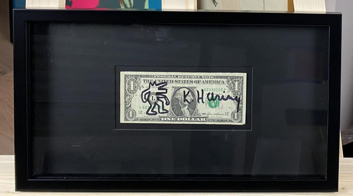 Originele tekening Keith Haring op 1 dollar biljet, geschatte waarde: 5500, afm plm: