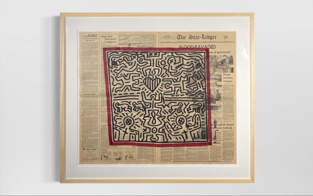 Originele tekening op krant door Keith Haring met certificaatstempel van de foundation - Galerijprijs: 38500 , afm plm 87x67