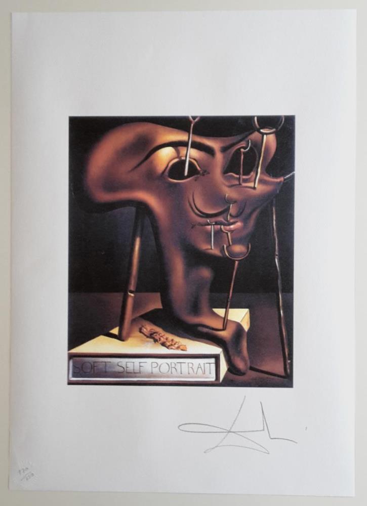 Kunstenaar: Salvador Dali (1904-1989) Titel: Soft Self-Portrait with Fried Bacon Salvador Dali (after) – GALA editions Lithografie naar het origineel uit 1941. Gesigneerd in de plaat en genummerd 170/350. 50*70 cm Reliëfstempel Dalart* NV – copyright 1981 Uiterst zeldzame lithografie. Fascinerend, surrealistisch en verwarrend. Dali's zachte zelfportret met gebakken spek zal net zo mysterieus en innemend blijven als Dali zelf was. *Dalart, a company created by the famous master Salvador Dali in the name of his wife Galatea. Dit werk wordt door de eigenaar opgestuurd, verzendingskosten België: € 25; Nederland/Frankrijk/Duitsland: € 30