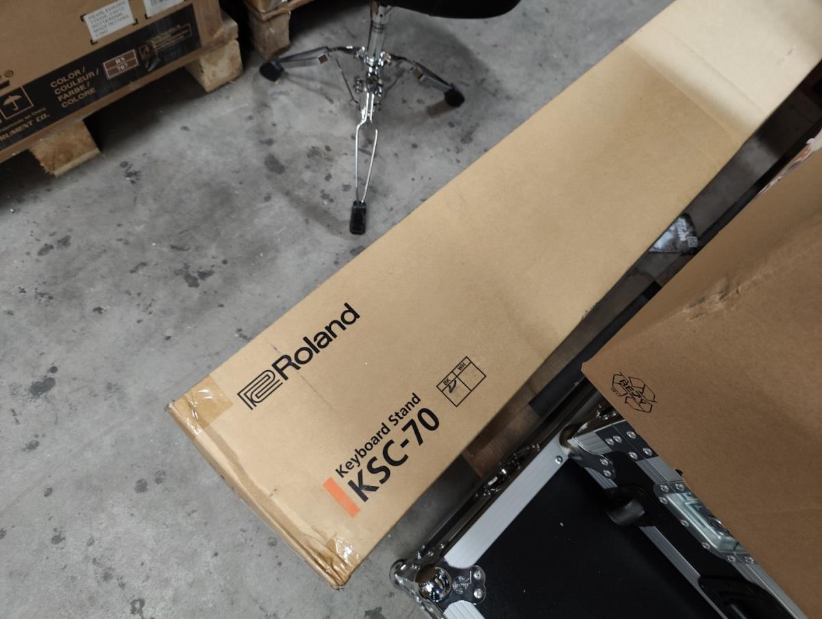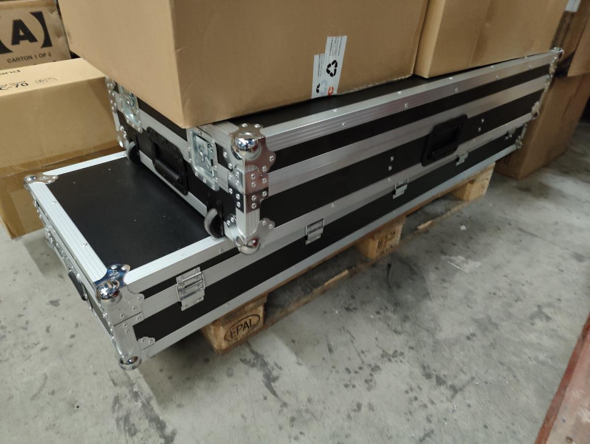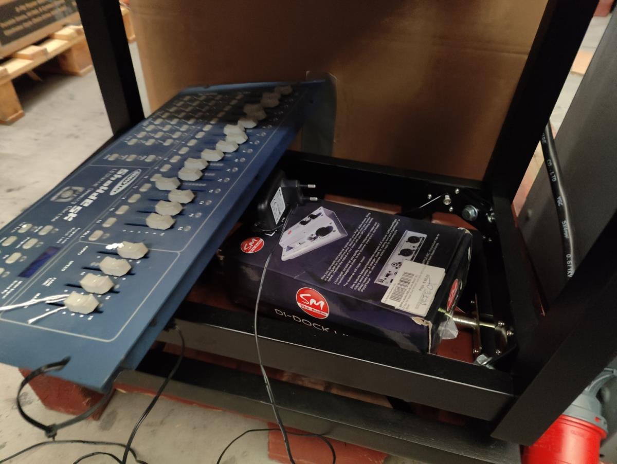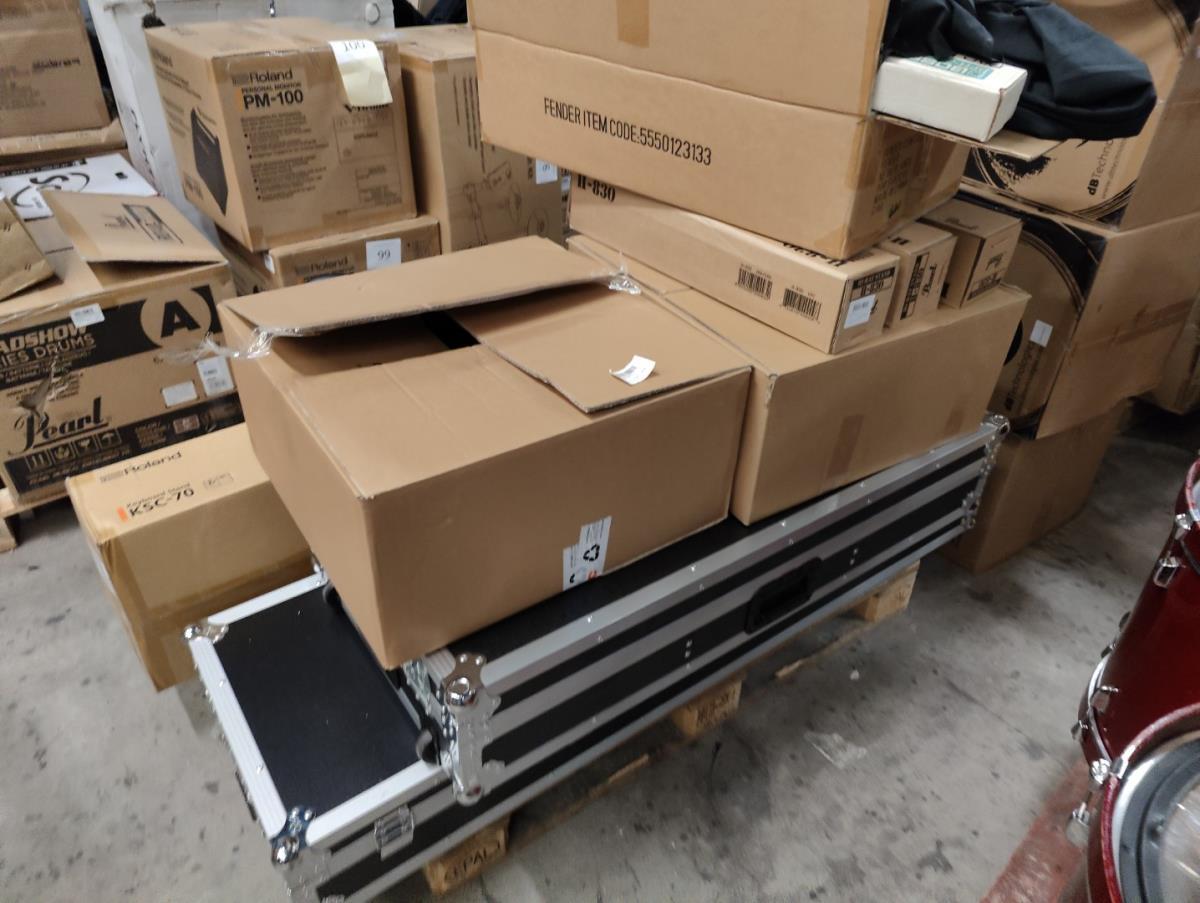 Waaronder: 2 grote flightcases, keyboardstand ROLAND, muziekstoel, kleine drum toebehoren, gitaar stickers, gitaar toebehoren, licht mixer en andere. Liggende op 2 palletten.